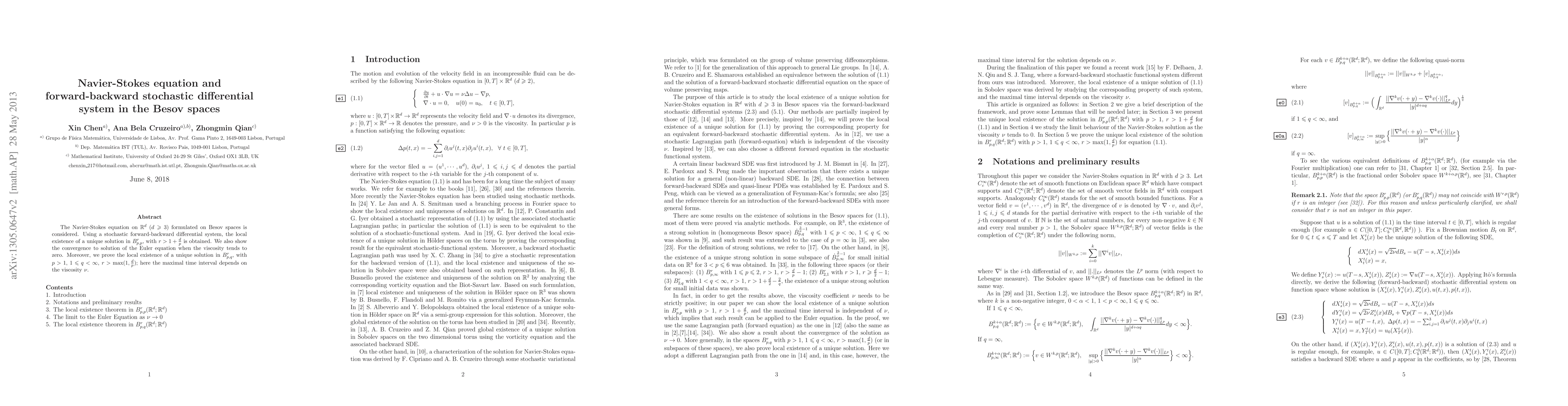 This paper investigates the Navier-Stokes equation in Besov spaces, proving the local existence of a unique solution via a stochastic forward-backward differential system. The study also demonstrates convergence to Euler equation solutions as viscosity approaches zero.