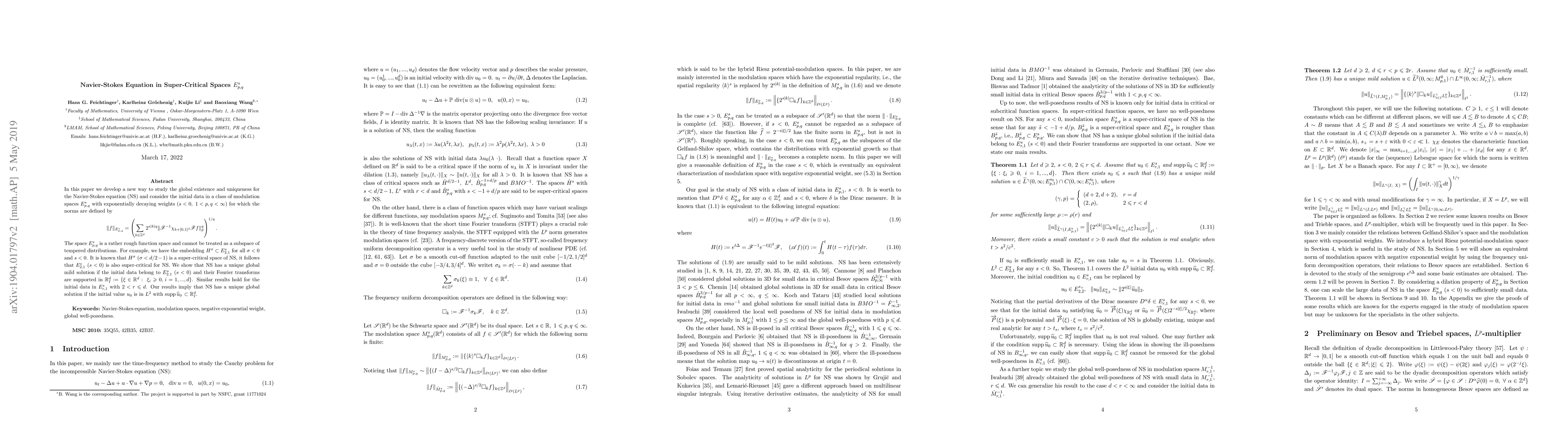 In this paper we develop a new way to study the global existence and uniqueness for the Navier-Stokes equation (NS) and consider the initial data in a class of modulation spaces $E^s_{p,q}$ with exponentially decaying weights $(s<0, \ 1