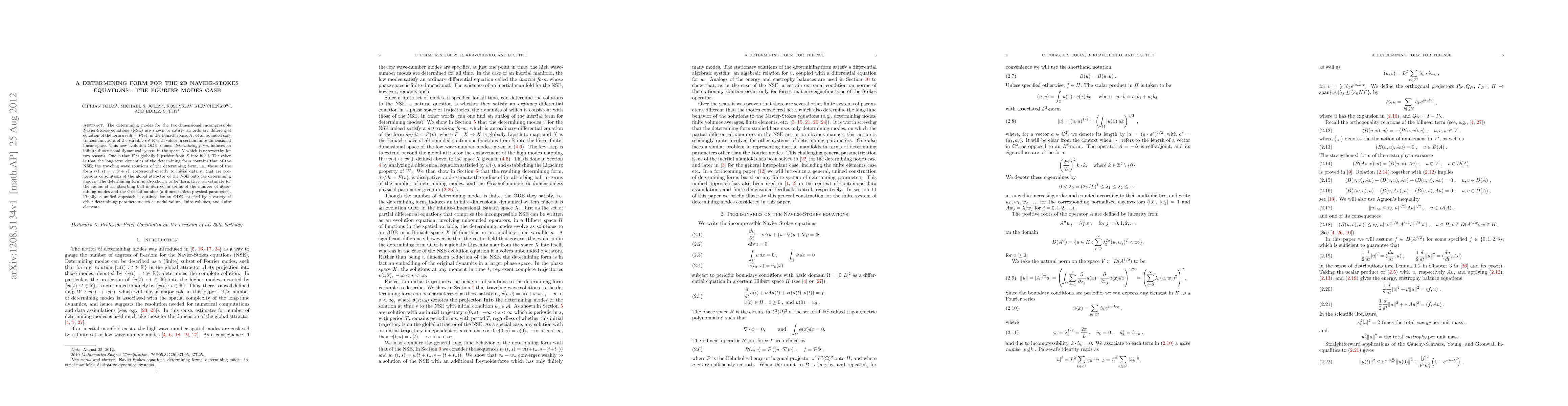 The determining modes for the two-dimensional incompressible Navier-Stokes equations (NSE) are shown to satisfy an ordinary differential equation of the form $dv/dt=F(v)$, in the Banach space, $X$, of all bounded continuous functions of the variable $s\in\mathbb{R}$ with values in certain finite-dimensional linear space. This new evolution ODE, named {\it determining form}, induces an infinite-dimensional dynamical system in the space $X$ which is noteworthy for two reasons. One is that $F$ is globally Lipschitz from $X$ into itself. The other is that the long-term dynamics of the determining form contains that of the NSE; the traveling wave solutions of the determining form, i.e., those of the form $v(t,s)=v_0(t+s)$, correspond exactly to initial data $v_0$ that are projections of solutions of the global attractor of the NSE onto the determining modes. The determining form is also shown to be dissipative; an estimate for the radius of an absorbing ball is derived in terms of the number of determining modes and the Grashof number (a dimensionless physical parameter). Finally, a unified approach is outlined for an ODE satisfied by a variety of other determining parameters such as nodal values, finite volumes, and finite elements.