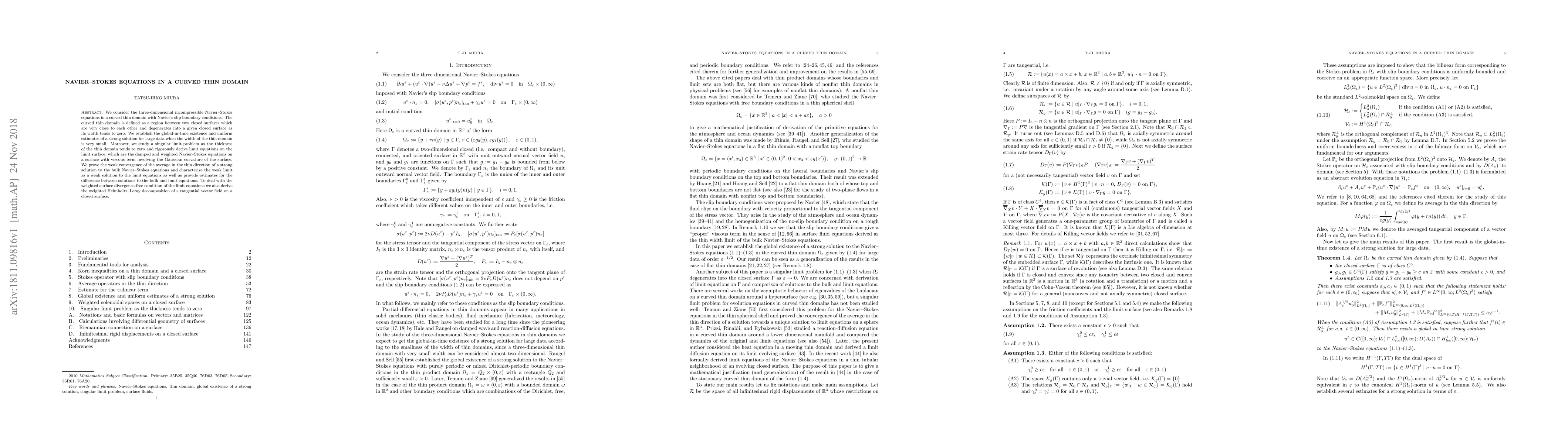 This paper establishes global-in-time existence and uniform estimates for strong solutions to the Navier-Stokes equations in a curved thin domain with Navier's slip conditions. It also investigates the singular limit as the domain thickness approaches zero, deriving limit equations on the surface and proving weak convergence to these equations.