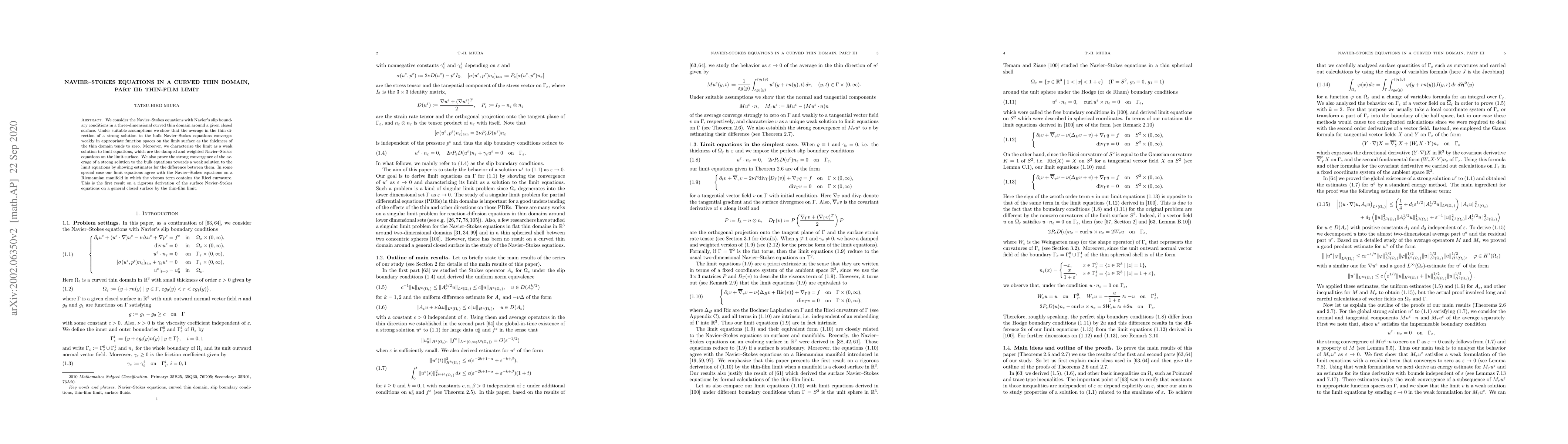 This paper rigorously derives the surface Navier-Stokes equations on a general closed surface via the thin-film limit, showing weak convergence of averaged bulk solutions and characterizing the limit as damped and weighted Navier-Stokes equations on the surface. Special cases align with Navier-Stokes on a Riemannian manifold with Ricci curvature.