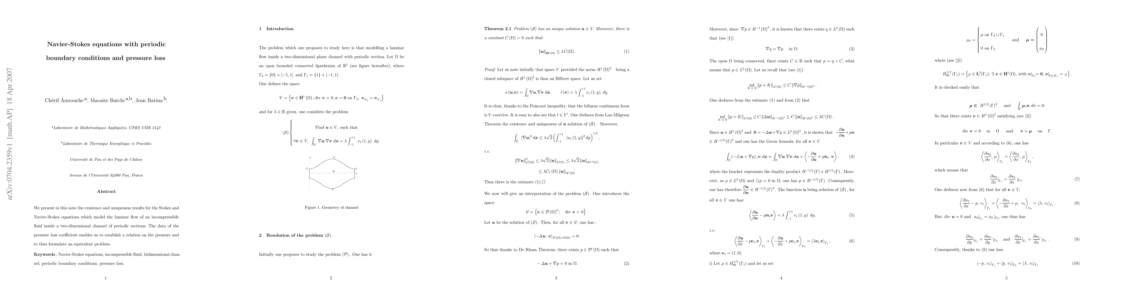 Researchers proved the existence and uniqueness of solutions for fluid flow in a two-dimensional channel with periodic sections, using Navier-Stokes equations and accounting for pressure loss.