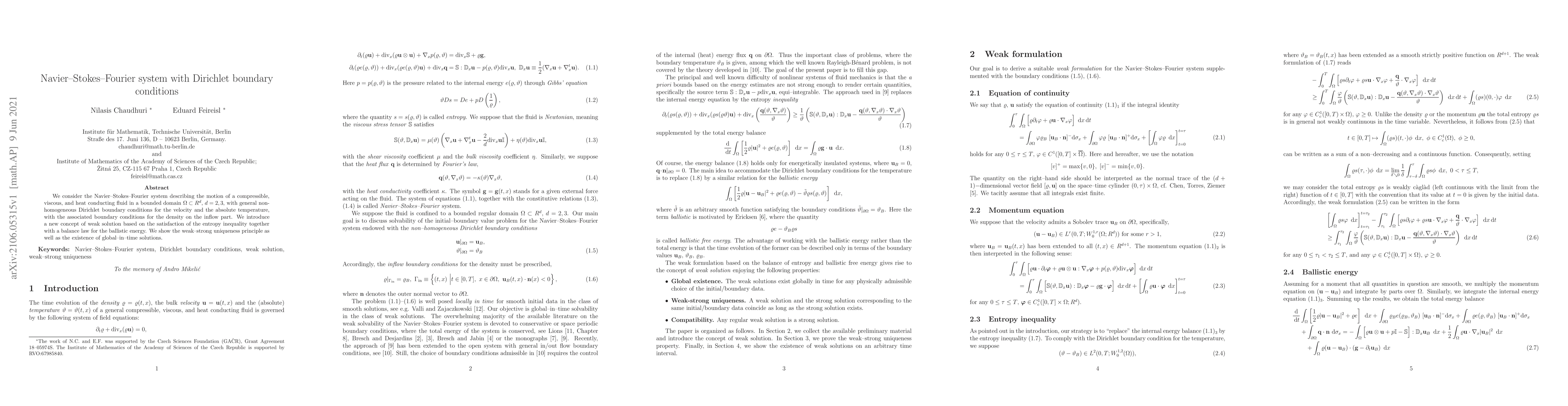 We consider the Navier--Stokes--Fourier system describing the motion of a compressible, viscous, and heat conducting fluid in a bounded domain with general non-homogeneous Dirichlet boundary conditions for the velocity and the absolute temperature, with the associated boundary conditions for the density on the inflow part. We introduce a new concept of weak solution based on the satisfaction of the entropy inequality together with a balance law for the ballistic energy. We show the weak-strong uniqueness principle as well as the existence of global-in-time solutions.
