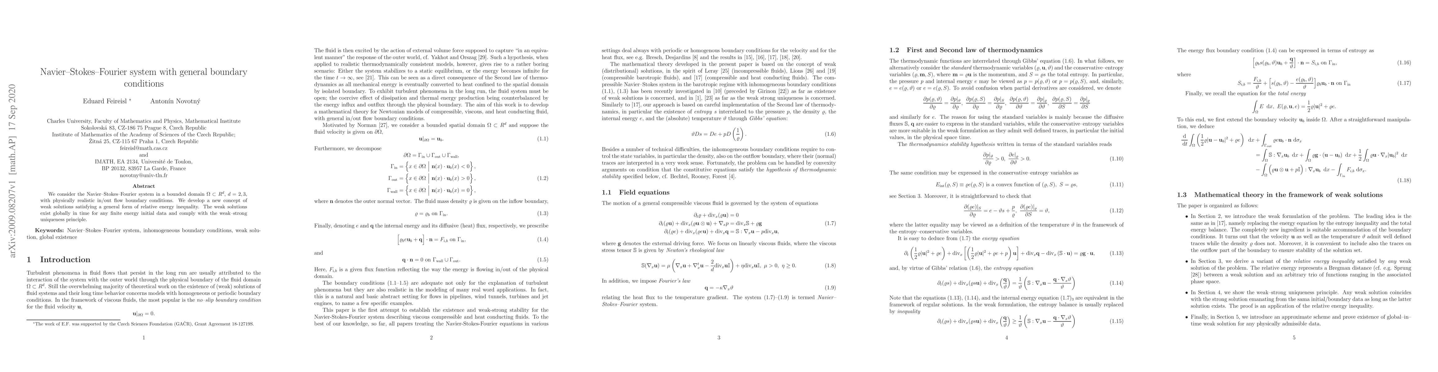 We consider the Navier--Stokes--Fourier system in a bounded domain $\Omega \subset R^d$, $d=2,3$, with physically realistic in/out flow boundary conditions. We develop a new concept of weak solutions satisfying a general form of relative energy inequality. The weak solutions exist globally in time for any finite energy initial data and comply with the weak--strong uniqueness principle.