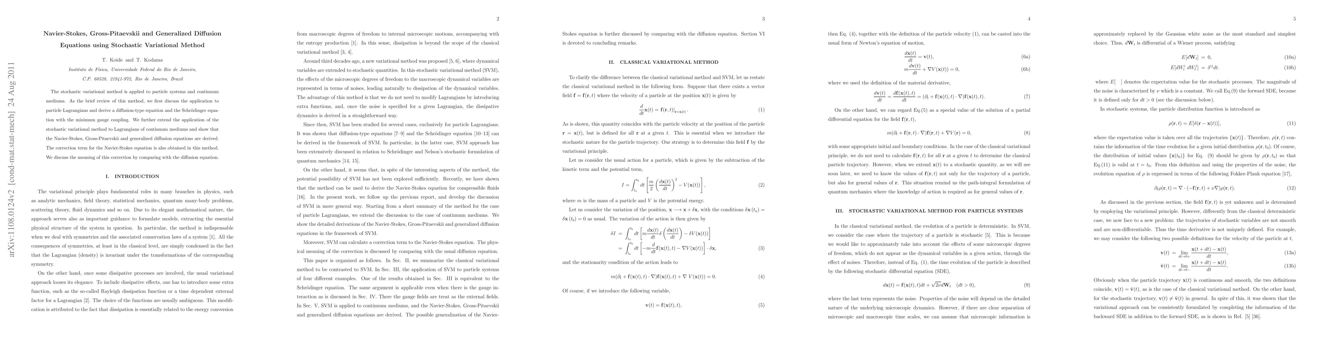 This paper applies the stochastic variational method to derive the Navier-Stokes, Gross-Pitaevskii, and generalized diffusion equations for both particle systems and continuum mediums. It also introduces a correction term for the Navier-Stokes equation and discusses its implications in comparison to the diffusion equation.