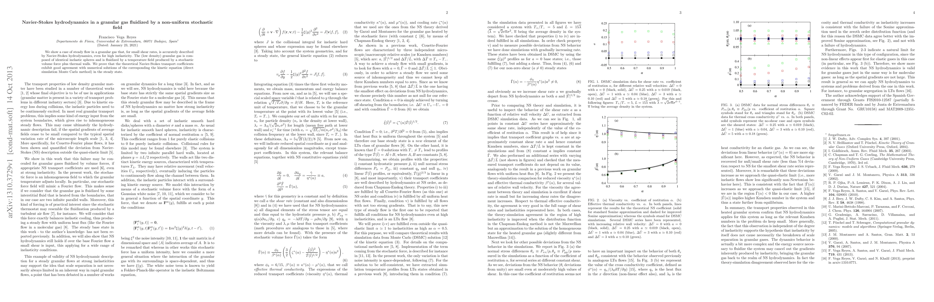 The paper presents a detailed theoretical and numerical analysis of granular gas hydrodynamics under non-uniform stochastic forcing, demonstrating the validity of Navier-Stokes description at high inelasticities.