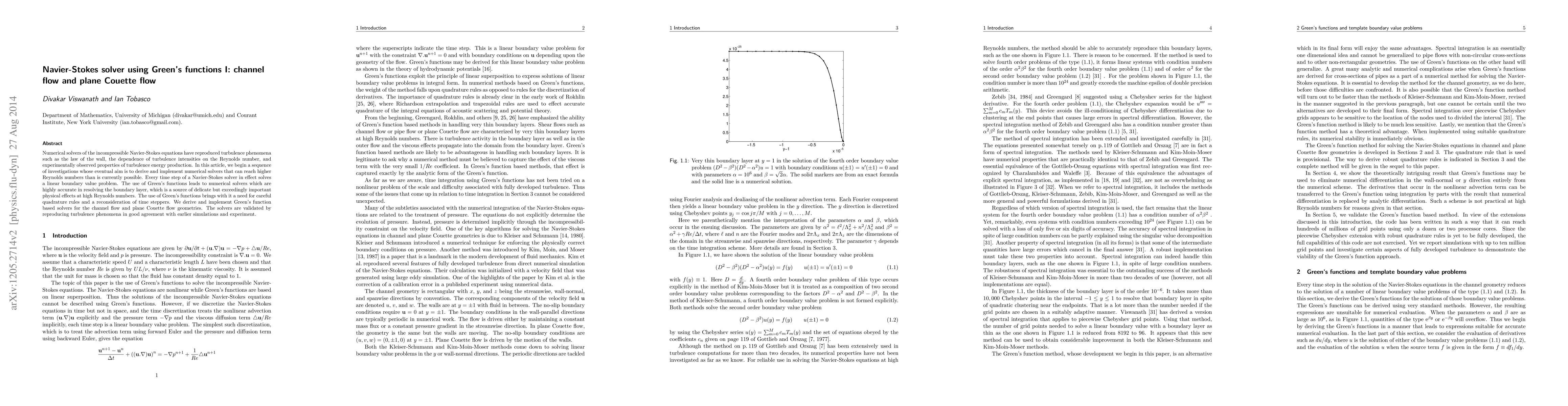 Numerical solvers of the incompressible Navier-Stokes equations have reproduced turbulence phenomena such as the law of the wall, the dependence of turbulence intensities on the Reynolds number, and experimentally observed properties of turbulence energy production. In this article, we begin a sequence of investigations whose eventual aim is to derive and implement numerical solvers that can reach higher Reynolds numbers than is currently possible. Every time step of a Navier-Stokes solver in effect solves a linear boundary value problem. The use of Green's functions leads to numerical solvers which are highly accurate in resolving the boundary layer, which is a source of delicate but exceedingly important physical effects at high Reynolds numbers. The use of Green's functions brings with it a need for careful quadrature rules and a reconsideration of time steppers. We derive and implement Green's function based solvers for the channel flow and plane Couette flow geometries. The solvers are validated by reproducing turbulent signals which are in good qualitative and quantitative agreement with experiment.