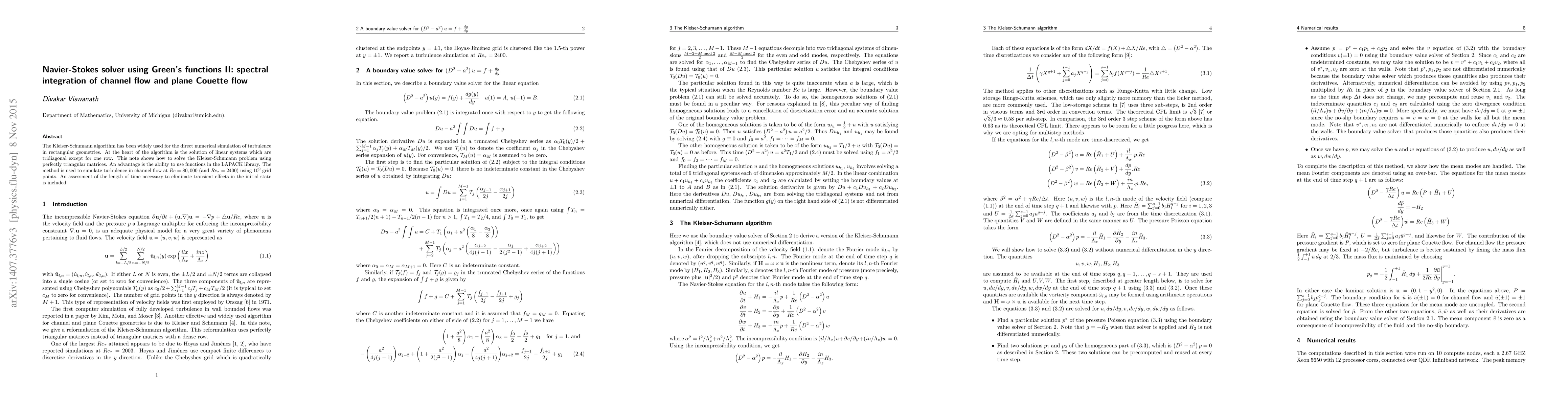 The Kleiser-Schumann algorithm has been widely used for the direct numerical simulation of turbulence in rectangular geometries. At the heart of the algorithm is the solution of linear systems which are tridiagonal except for one row. This note shows how to solve the Kleiser-Schumann problem using perfectly triangular matrices. An advantage is the ability to use functions in the LAPACK library. The method is used to simulate turbulence in channel flow at $Re=80,000$ (and $Re_{\tau}=2400$) using $10^{9}$ grid points. An assessment of the length of time necessary to eliminate transient effects in the initial state is included.