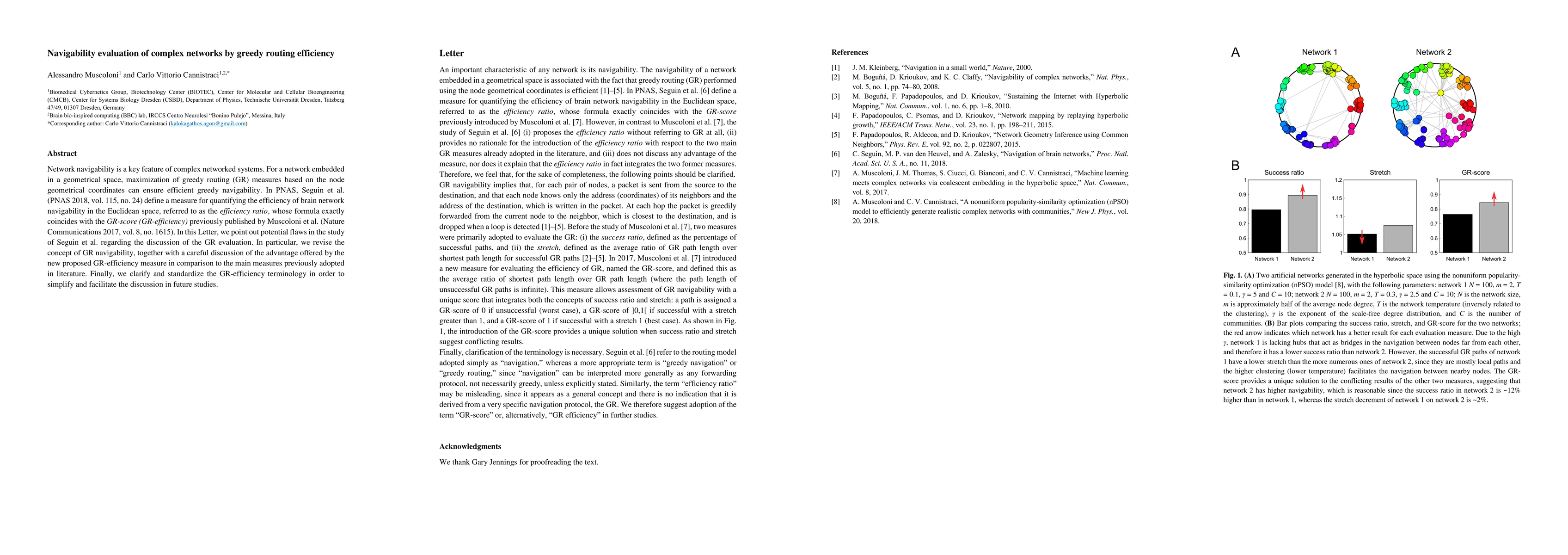 Network navigability is a key feature of complex networked systems. For a network embedded in a geometrical space, maximization of greedy routing (GR) measures based on the node geometrical coordinates can ensure efficient greedy navigability. In PNAS, Seguin et al. (PNAS 2018, vol. 115, no. 24) define a measure for quantifying the efficiency of brain network navigability in the Euclidean space, referred to as the efficiency ratio, whose formula exactly coincides with the GR-score (GR-efficiency) previously published by Muscoloni et al. (Nature Communications 2017, vol. 8, no. 1615). In this Letter, we point out potential flaws in the study of Seguin et al. regarding the discussion of the GR evaluation. In particular, we revise the concept of GR navigability, together with a careful discussion of the advantage offered by the new proposed GR-efficiency measure in comparison to the main measures previously adopted in literature. Finally, we clarify and standardize the GR-efficiency terminology in order to simplify and facilitate the discussion in future studies.