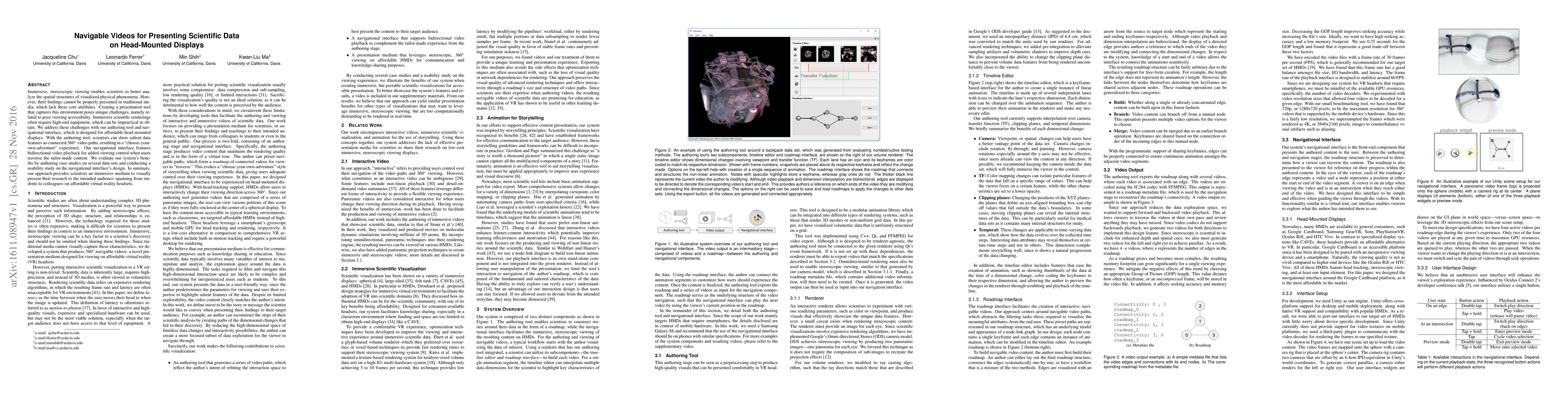 This paper introduces a novel authoring tool and navigational interface for creating immersive, affordable video presentations of scientific data on head-mounted displays. The 'choose-your-own-adventure' experience allows scientists to highlight key data features along 360° video paths. Usability studies demonstrate its effectiveness for diverse audiences, from students to colleagues, on budget-friendly VR headsets.