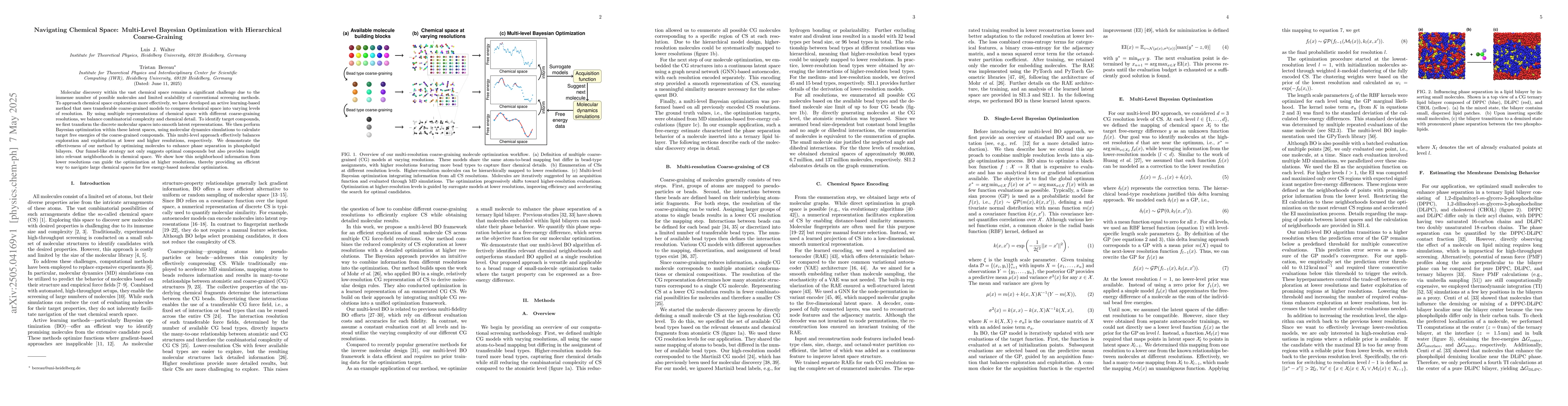 Molecular discovery within the vast chemical space remains a significant challenge due to the immense number of possible molecules and limited scalability of conventional screening methods. To approach chemical space exploration more effectively, we have developed an active learning-based method that uses transferable coarse-grained models to compress chemical space into varying levels of resolution. By using multiple representations of chemical space with different coarse-graining resolutions, we balance combinatorial complexity and chemical detail. To identify target compounds, we first transform the discrete molecular spaces into smooth latent representations. We then perform Bayesian optimization within these latent spaces, using molecular dynamics simulations to calculate target free energies of the coarse-grained compounds. This multi-level approach effectively balances exploration and exploitation at lower and higher resolutions, respectively. We demonstrate the effectiveness of our method by optimizing molecules to enhance phase separation in phospholipid bilayers. Our funnel-like strategy not only suggests optimal compounds but also provides insight into relevant neighborhoods in chemical space. We show how this neighborhood information from lower resolutions can guide the optimization at higher resolutions, thereby providing an efficient way to navigate large chemical spaces for free energy-based molecular optimization.