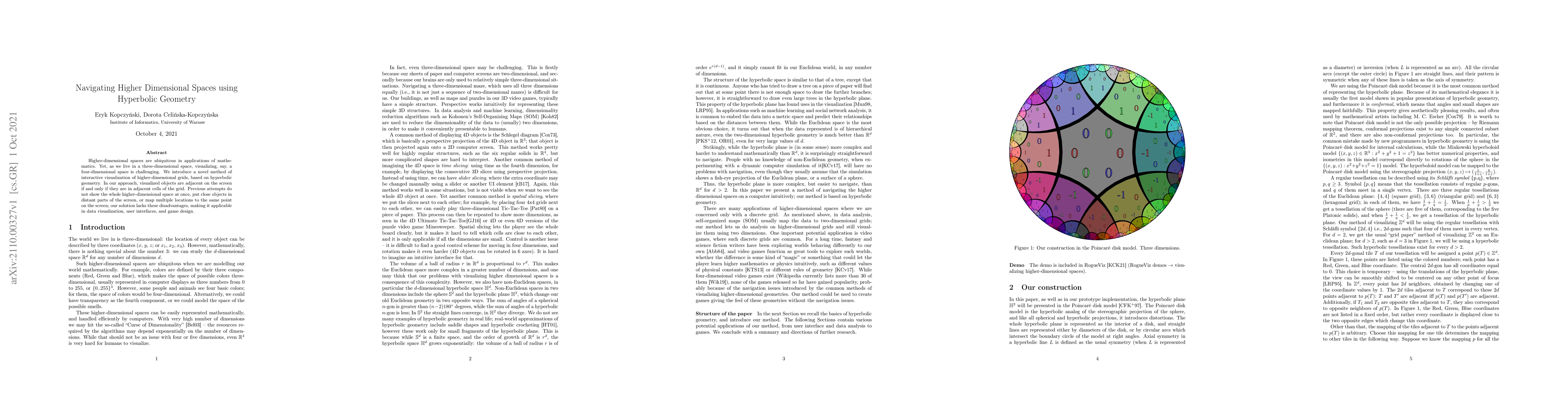 Higher-dimensional spaces are ubiquitous in applications of mathematics. Yet, as we live in a three-dimensional space, visualizing, say, a four-dimensional space is challenging. We introduce a novel method of interactive visualization of higher-dimensional grids, based on hyperbolic geometry. In our approach, visualized objects are adjacent on the screen if and only if they are in adjacent cells of the grid. Previous attempts do not show the whole higher-dimensional space at once, put close objects in distant parts of the screen, or map multiple locations to the same point on the screen; our solution lacks these disadvantages, making it applicable in data visualization, user interfaces, and game design.