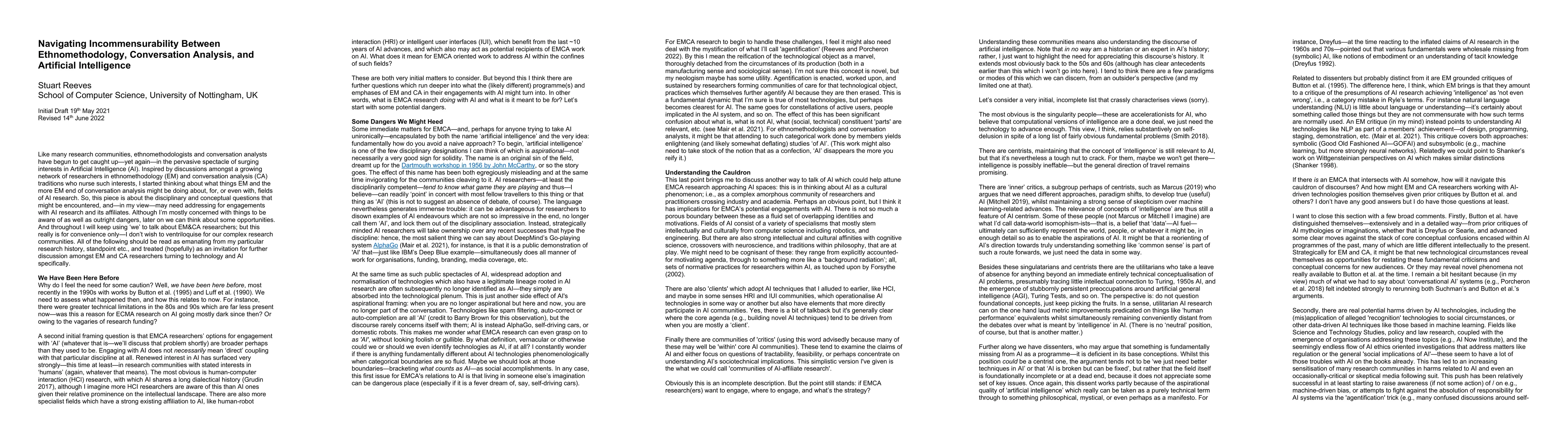 Like many research communities, ethnomethodologists and conversation analysts have begun to get caught up -- yet again -- in the pervasive spectacle of surging interests in Artificial Intelligence (AI). Inspired by discussions amongst a growing network of researchers in ethnomethodology (EM) and conversation analysis (CA) traditions who nurse such interests, I started thinking about what things EM and the more EM end of conversation analysis might be doing about, for, or even with, fields of AI research. So, this piece is about the disciplinary and conceptual questions that might be encountered, and -- in my view -- may need addressing for engagements with AI research and its affiliates. Although I'm mostly concerned with things to be aware of as well as outright dangers, later on we can think about some opportunities. And throughout I will keep using 'we' to talk about EM&CA researchers; but this really is for convenience only -- I don't wish to ventriloquise for our complex research communities. All of the following should be read as emanating from my particular research history, standpoint etc., and treated (hopefully) as an invitation for further discussion amongst EM and CA researchers turning to technology and AI specifically.