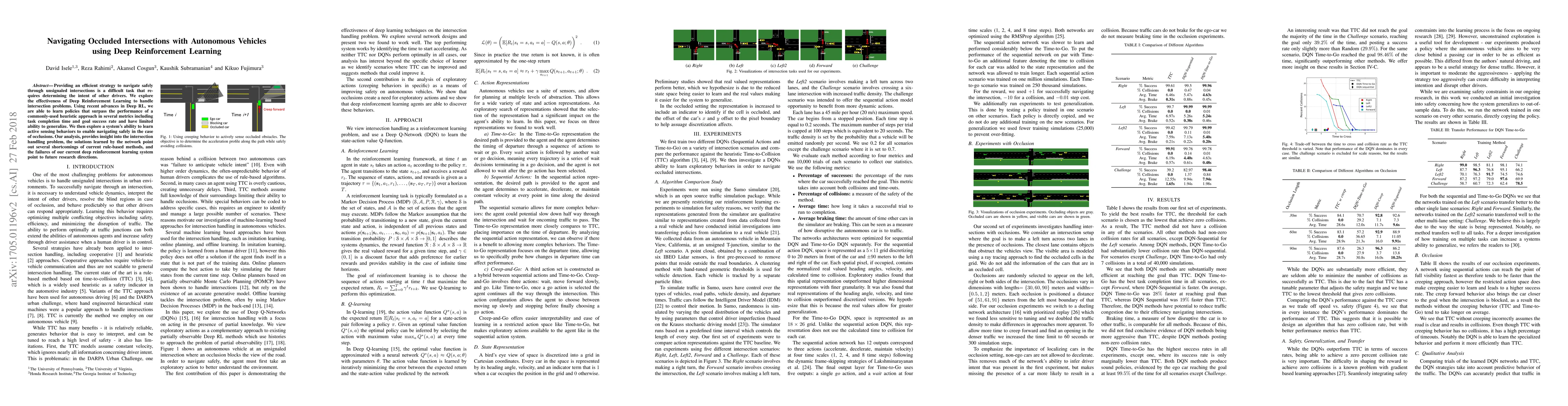 This paper explores the use of Deep Reinforcement Learning to navigate autonomous vehicles through unsignaled intersections, demonstrating improved performance over heuristic methods in task completion and success rates. The study also investigates the system's ability to handle occlusions, revealing limitations and suggesting avenues for future research.