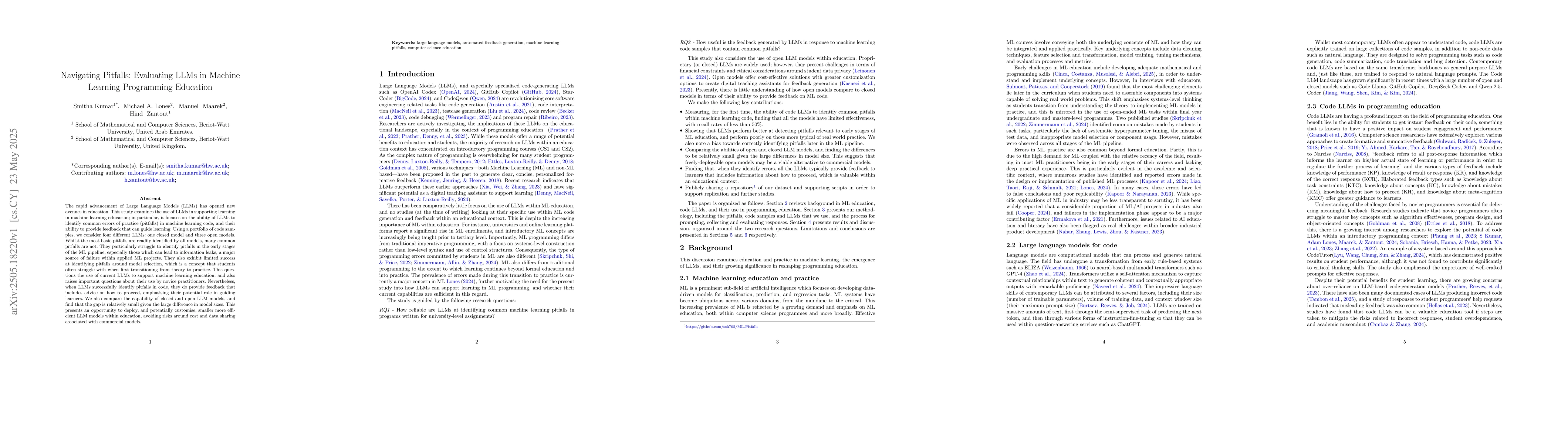 This research distinguishes itself by focusing on LLMs' ability to identify pitfalls in machine learning code and their potential role in guiding learners, while also comparing closed and open models for educational deployment.