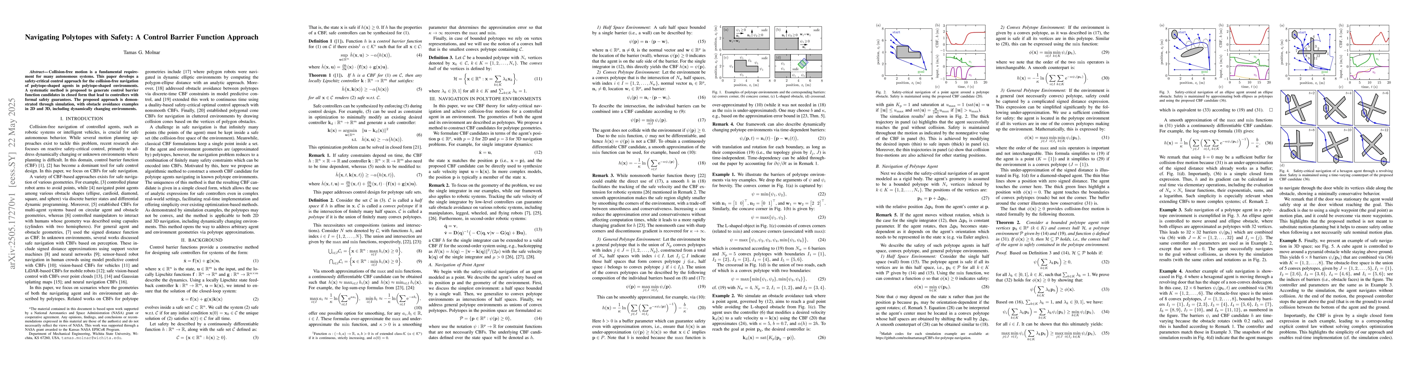 The paper proposes a systematic method to generate control barrier function candidates in closed form for collision-free navigation of polytope-shaped agents in polytope-shaped environments, ensuring formal safety guarantees.