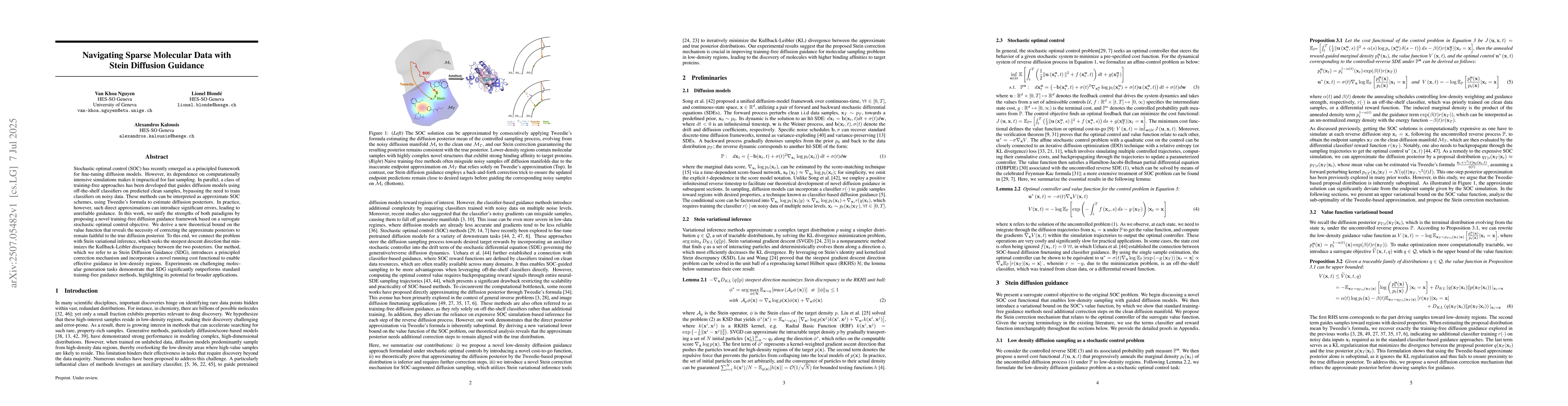 Stochastic optimal control (SOC) has recently emerged as a principled framework for fine-tuning diffusion models. However, its dependence on computationally intensive simulations makes it impractical for fast sampling. In parallel, a class of training-free approaches has been developed that guides diffusion models using off-the-shelf classifiers on predicted clean samples, bypassing the need to train classifiers on noisy data. These methods can be interpreted as approximate SOC schemes, using Tweedie's formula to estimate diffusion posteriors. In practice, however, such direct approximations can introduce significant errors, leading to unreliable guidance. In this work, we unify the strengths of both paradigms by proposing a novel training-free diffusion guidance framework based on a surrogate stochastic optimal control objective. We derive a new theoretical bound on the value function that reveals the necessity of correcting the approximate posteriors to remain faithful to the true diffusion posterior. To this end, we connect the problem with Stein variational inference, which seeks the steepest descent direction that minimizes the Kullback-Leibler discrepancy between the two posteriors. Our method, which we refer to as Stein Diffusion Guidance (SDG), introduces a principled correction mechanism and incorporates a novel running cost functional to enable effective guidance in low-density regions. Experiments on challenging molecular generation tasks demonstrate that SDG significantly outperforms standard training-free guidance methods, highlighting its potential for broader applications.
