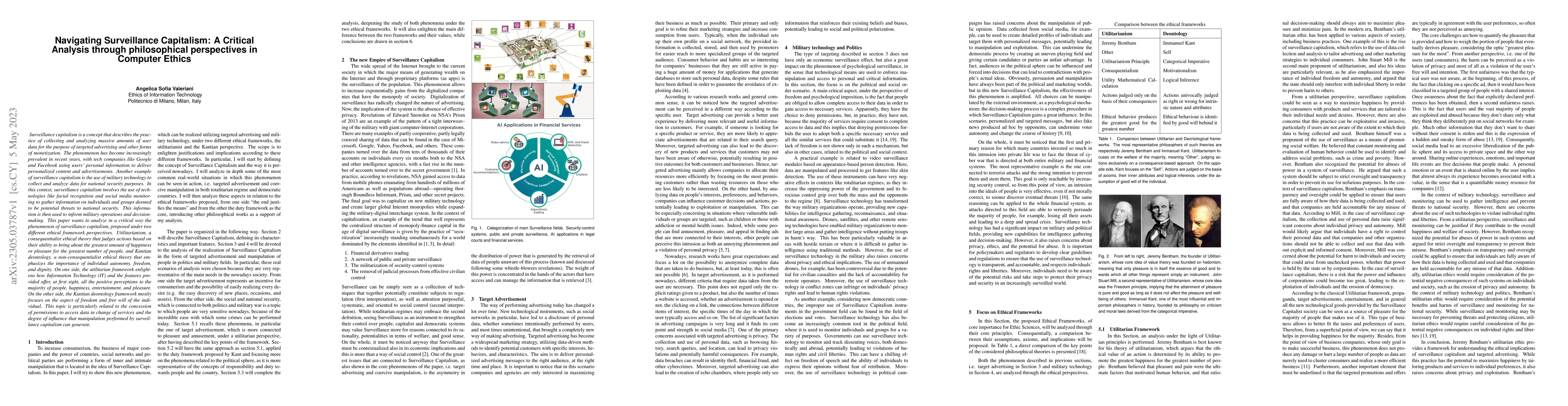 This paper critically analyzes surveillance capitalism through utilitarian and Kantian ethical frameworks, examining how tech companies monetize user data for targeted advertising while juxtaposing the perceived benefits of IT against the ethical implications of individual autonomy and freedom.