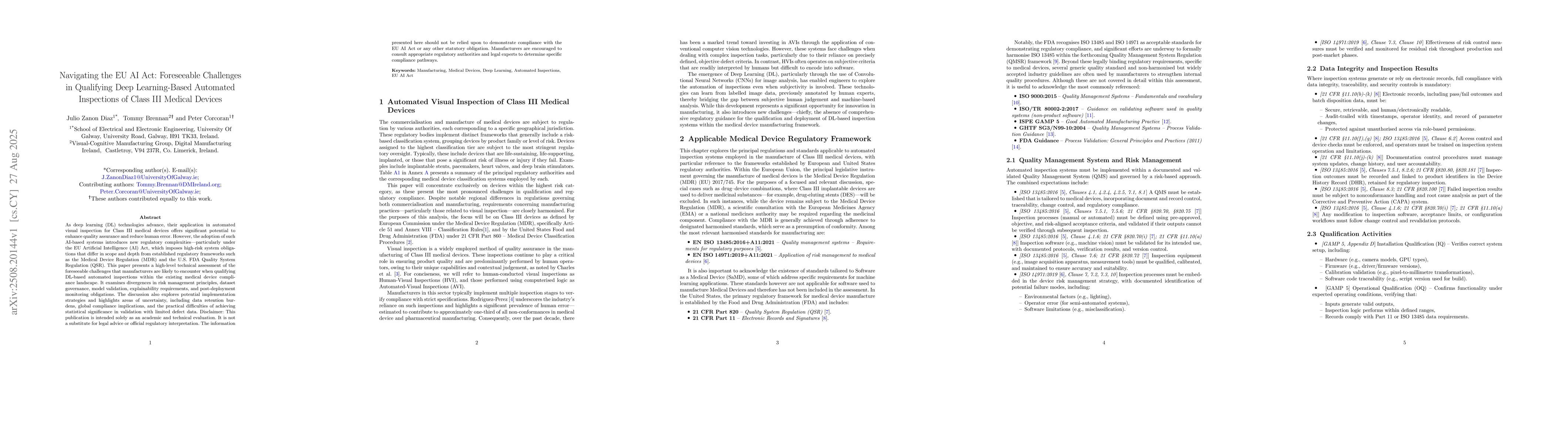 As deep learning (DL) technologies advance, their application in automated visual inspection for Class III medical devices offers significant potential to enhance quality assurance and reduce human error. However, the adoption of such AI-based systems introduces new regulatory complexities--particularly under the EU Artificial Intelligence (AI) Act, which imposes high-risk system obligations that differ in scope and depth from established regulatory frameworks such as the Medical Device Regulation (MDR) and the U.S. FDA Quality System Regulation (QSR). This paper presents a high-level technical assessment of the foresee-able challenges that manufacturers are likely to encounter when qualifying DL-based automated inspections within the existing medical device compliance landscape. It examines divergences in risk management principles, dataset governance, model validation, explainability requirements, and post-deployment monitoring obligations. The discussion also explores potential implementation strategies and highlights areas of uncertainty, including data retention burdens, global compliance implications, and the practical difficulties of achieving statistical significance in validation with limited defect data. Disclaimer: This publication is in-tended solely as an academic and technical evaluation. It is not a substitute for le-gal advice or official regulatory interpretation. The information presented here should not be relied upon to demonstrate compliance with the EU AI Act or any other statutory obligation. Manufacturers are encouraged to consult appropriate regulatory authorities and legal experts to determine specific compliance pathways.