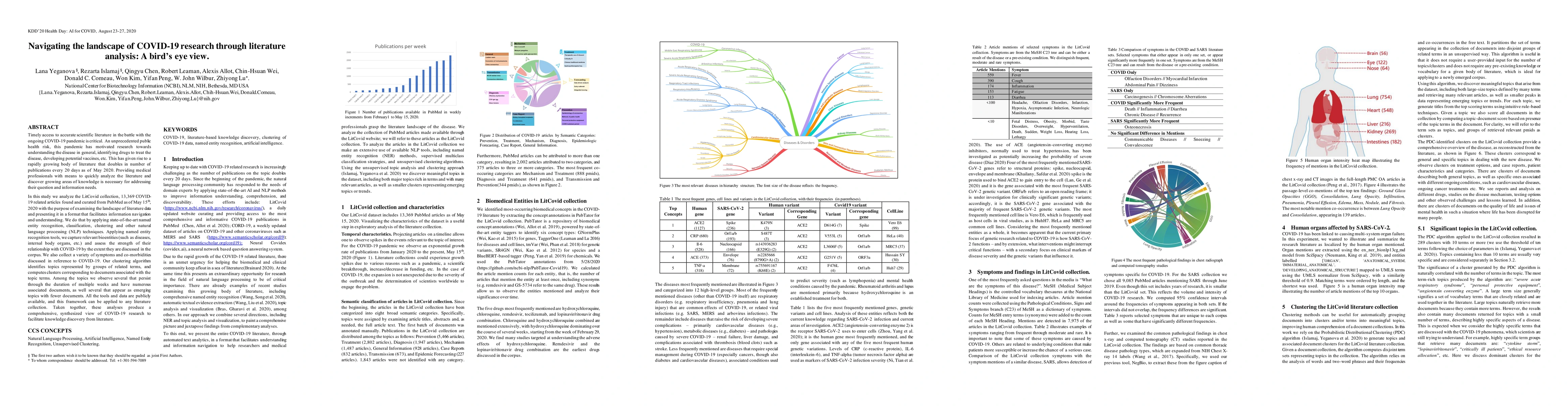 Timely access to accurate scientific literature in the battle with the ongoing COVID-19 pandemic is critical. This unprecedented public health risk has motivated research towards understanding the disease in general, identifying drugs to treat the disease, developing potential vaccines, etc. This has given rise to a rapidly growing body of literature that doubles in number of publications every 20 days as of May 2020. Providing medical professionals with means to quickly analyze the literature and discover growing areas of knowledge is necessary for addressing their question and information needs. In this study we analyze the LitCovid collection, 13,369 COVID-19 related articles found in PubMed as of May 15th, 2020 with the purpose of examining the landscape of literature and presenting it in a format that facilitates information navigation and understanding. We do that by applying state-of-the-art named entity recognition, classification, clustering and other NLP techniques. By applying NER tools, we capture relevant bioentities (such as diseases, internal body organs, etc.) and assess the strength of their relationship with COVID-19 by the extent they are discussed in the corpus. We also collect a variety of symptoms and co-morbidities discussed in reference to COVID-19. Our clustering algorithm identifies topics represented by groups of related terms, and computes clusters corresponding to documents associated with the topic terms. Among the topics we observe several that persist through the duration of multiple weeks and have numerous associated documents, as well several that appear as emerging topics with fewer documents. All the tools and data are publicly available, and this framework can be applied to any literature collection. Taken together, these analyses produce a comprehensive, synthesized view of COVID-19 research to facilitate knowledge discovery from literature.