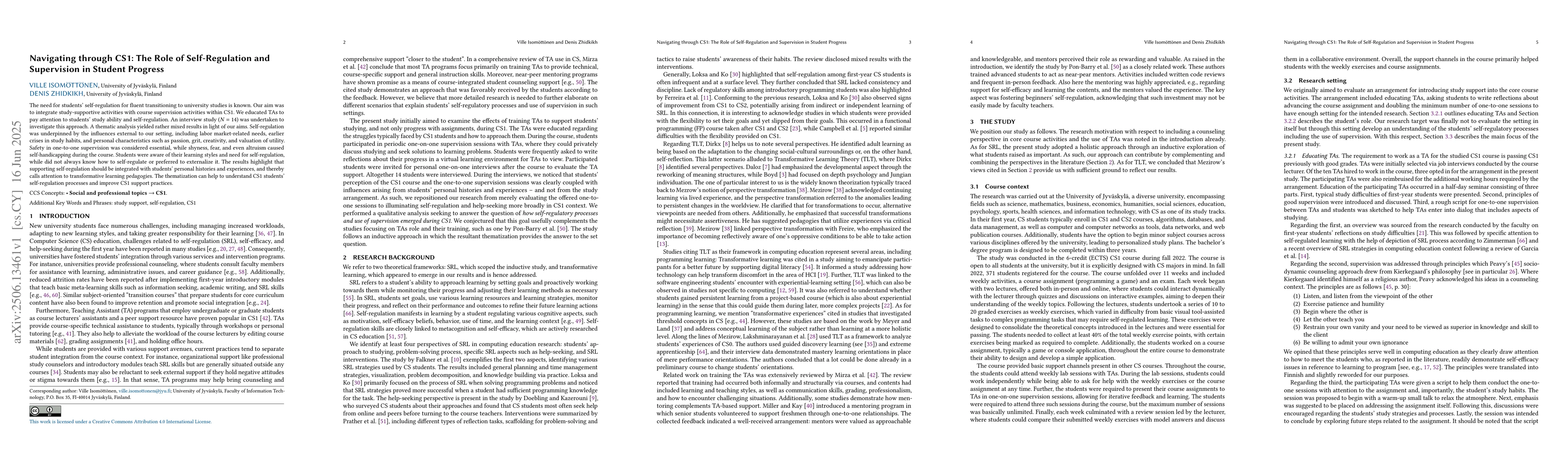 The need for students' self-regulation for fluent transitioning to university studies is known. Our aim was to integrate study-supportive activities with course supervision activities within CS1. We educated TAs to pay attention to students' study ability and self-regulation. An interview study ($N=14$) was undertaken to investigate this approach. A thematic analysis yielded rather mixed results in light of our aims. Self-regulation was underpinned by the influences external to our setting, including labor market-related needs, earlier crises in study habits, and personal characteristics such as passion, grit, creativity, and valuation of utility. Safety in one-to-one supervision was considered essential, while shyness, fear, and even altruism caused self-handicapping during the course. Students were aware of their learning styles and need for self-regulation, while did not always know how to self-regulate or preferred to externalize it. The results highlight that supporting self-regulation should be integrated with students' personal histories and experiences, and thereby calls attention to transformative learning pedagogies. The thematization can help to understand CS1 students' self-regulation processes and improve CS1 support practices.