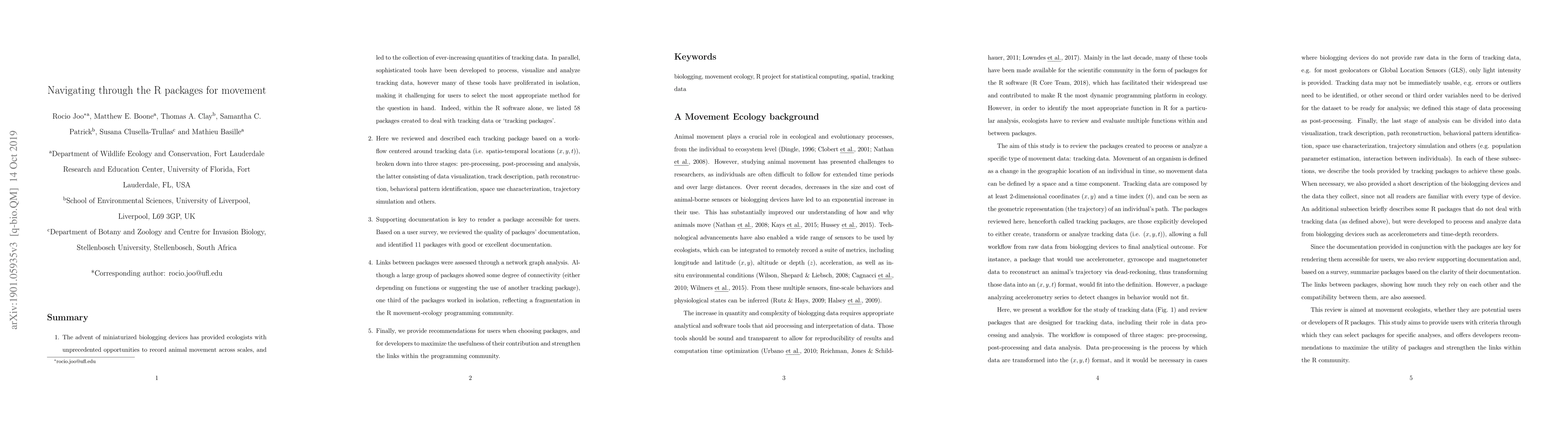 This paper reviews 58 R packages for analyzing animal movement data, categorizing them into pre-processing, post-processing, and analysis stages. It highlights 11 packages with high-quality documentation and identifies fragmentation in the R movement-ecology community, recommending improvements for both users and developers.