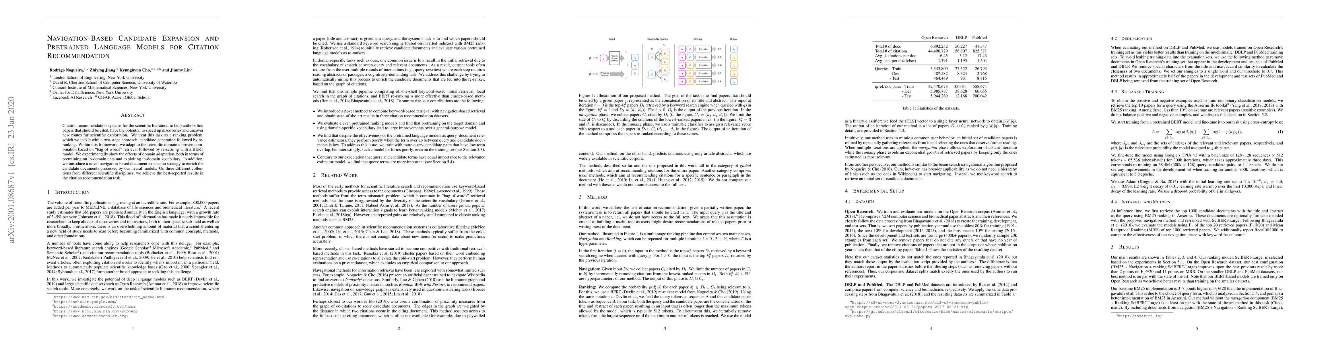 Citation recommendation systems for the scientific literature, to help authors find papers that should be cited, have the potential to speed up discoveries and uncover new routes for scientific exploration. We treat this task as a ranking problem, which we tackle with a two-stage approach: candidate generation followed by re-ranking. Within this framework, we adapt to the scientific domain a proven combination based on "bag of words" retrieval followed by re-scoring with a BERT model. We experimentally show the effects of domain adaptation, both in terms of pretraining on in-domain data and exploiting in-domain vocabulary. In addition, we introduce a novel navigation-based document expansion strategy to enrich the candidate documents processed by our neural models. On three different collections from different scientific disciplines, we achieve the best-reported results in the citation recommendation task.