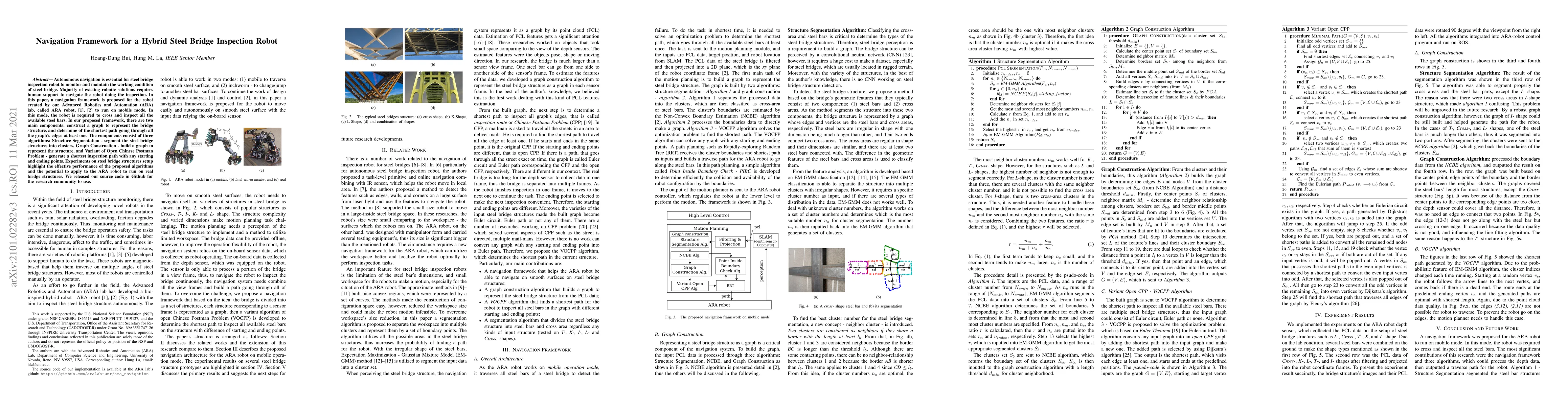 This research proposes a navigation framework for the ARA robot to autonomously inspect steel bridges. The framework includes four algorithms for depth data processing, structure graph construction, shortest path generation, and configuration determination, validated through experiments on setups mimicking real bridges. Source code is available on GitHub for community use.