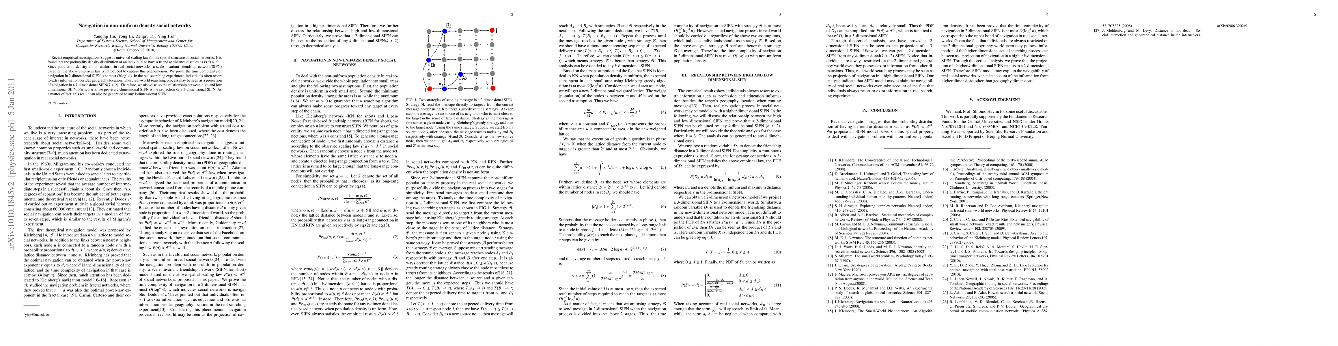 This paper investigates navigation in social networks with non-uniform density, proposing a scale-invariant friendship network model that captures this phenomenon. It proves the time complexity of navigation in 2D and k-dimensional models, revealing that 2D is the projection of a higher-dimensional model.