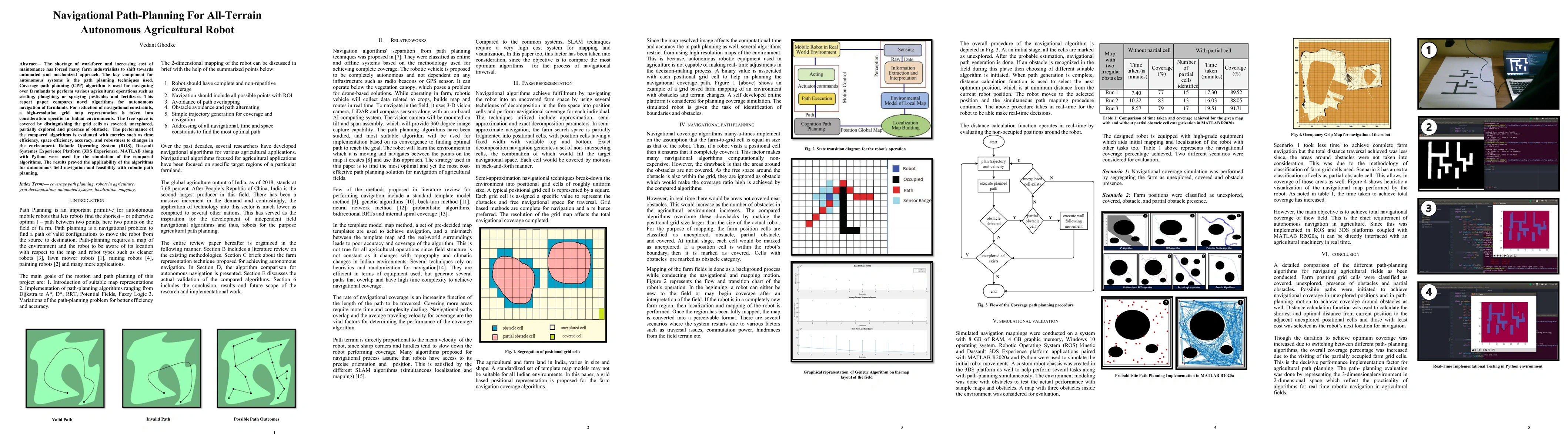 This paper develops novel path-planning algorithms for autonomous agricultural robots to navigate Indian farmlands efficiently, focusing on time efficiency, space efficiency, accuracy, and robustness.