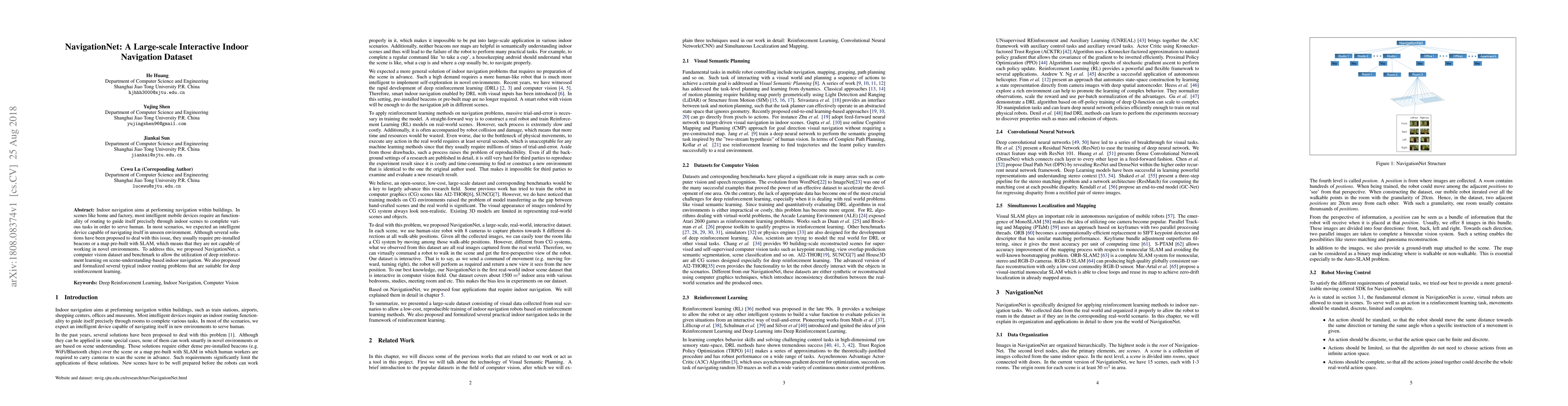 NavigationNet provides a large-scale interactive indoor navigation dataset and benchmark, enabling deep reinforcement learning for scene-understanding-based navigation in novel environments without pre-installed beacons or pre-built maps. It formalizes typical indoor routing problems suitable for advanced machine learning techniques.