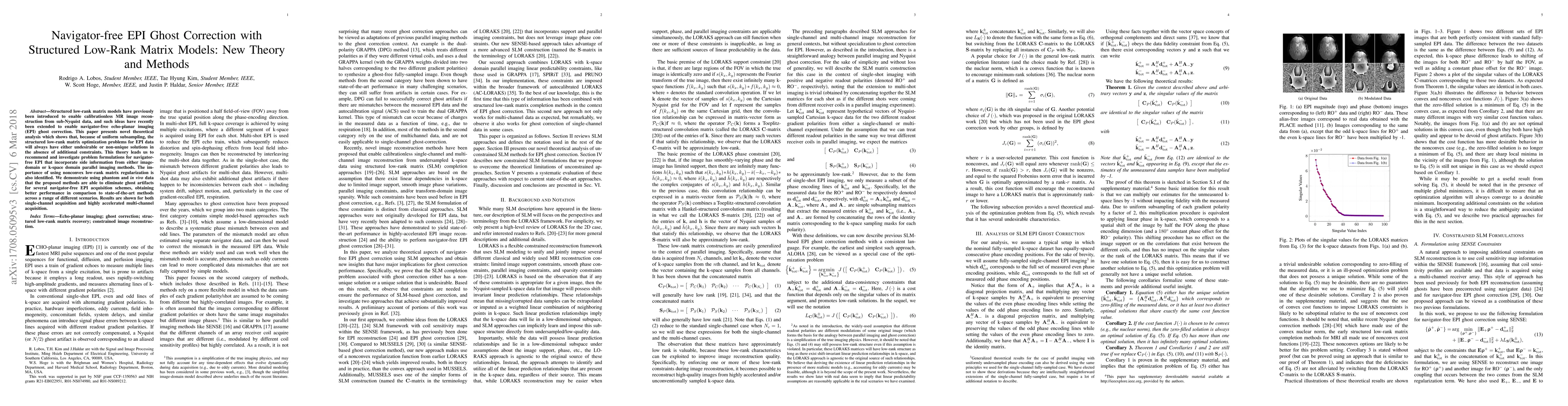 This paper introduces novel theoretical analysis and methods for navigator-free echo-planar imaging (EPI) ghost correction using structured low-rank matrix models. The proposed methods incorporate additional constraints from parallel imaging to address non-unique solutions, demonstrating superior performance in eliminating ghost artifacts compared to existing techniques.