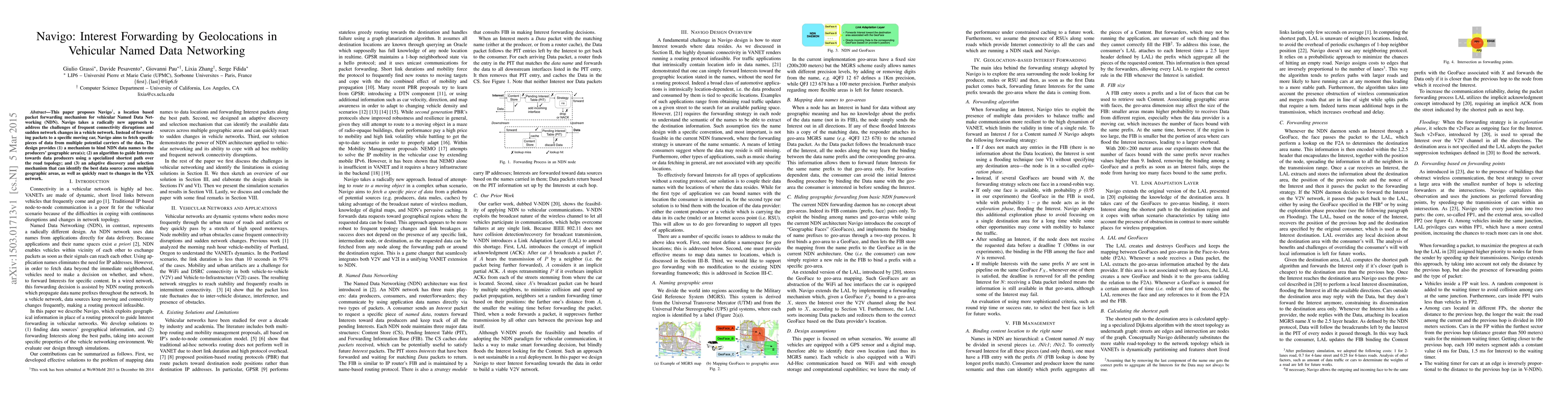 Navigo is a novel location-based packet forwarding mechanism for vehicular Named Data Networking, designed to address frequent connectivity disruptions by fetching data from multiple potential carriers rather than specific moving cars. It includes mechanisms for binding data names to geographic areas, an algorithm for optimal Interest routing, and an adaptive discovery system for selecting the best data source.
