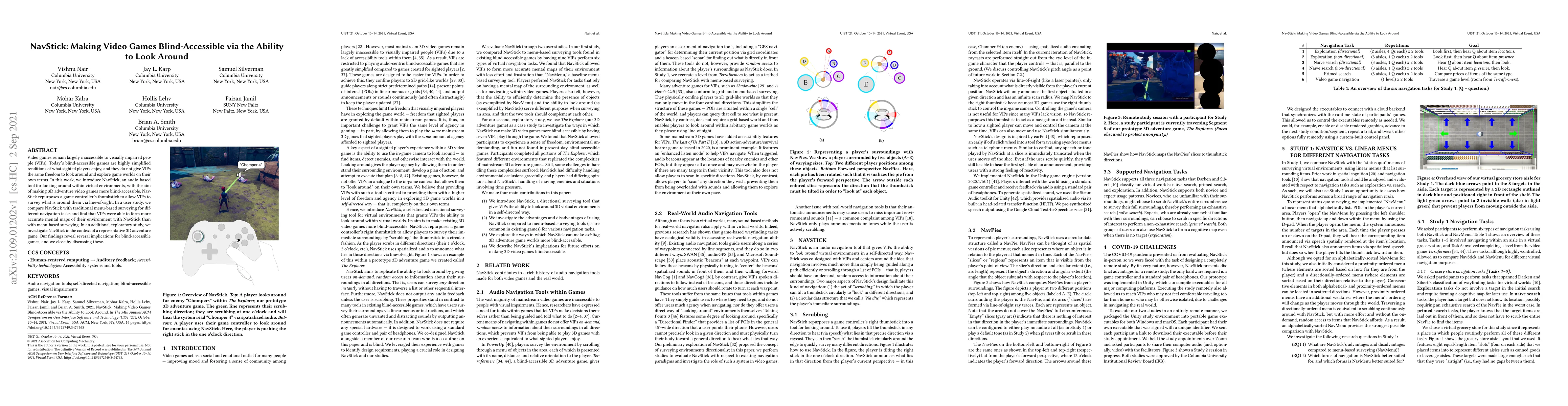 NavStick is an audio-based tool designed to enable visually impaired players to explore 3D adventure video games by repurposing a controller's thumbstick for spatial awareness. Studies show that it helps players form more accurate mental maps compared to traditional menu-based navigation.