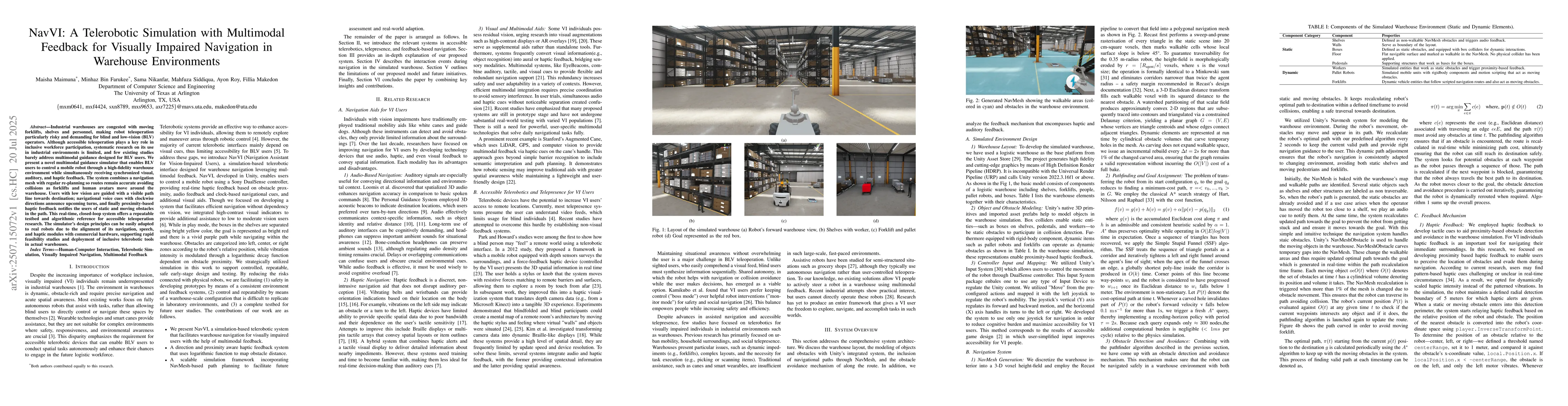 Industrial warehouses are congested with moving forklifts, shelves and personnel, making robot teleoperation particularly risky and demanding for blind and low-vision (BLV) operators. Although accessible teleoperation plays a key role in inclusive workforce participation, systematic research on its use in industrial environments is limited, and few existing studies barely address multimodal guidance designed for BLV users. We present a novel multimodal guidance simulator that enables BLV users to control a mobile robot through a high-fidelity warehouse environment while simultaneously receiving synchronized visual, auditory, and haptic feedback. The system combines a navigation mesh with regular re-planning so routes remain accurate avoiding collisions as forklifts and human avatars move around the warehouse. Users with low vision are guided with a visible path line towards destination; navigational voice cues with clockwise directions announce upcoming turns, and finally proximity-based haptic feedback notifies the users of static and moving obstacles in the path. This real-time, closed-loop system offers a repeatable testbed and algorithmic reference for accessible teleoperation research. The simulator's design principles can be easily adapted to real robots due to the alignment of its navigation, speech, and haptic modules with commercial hardware, supporting rapid feasibility studies and deployment of inclusive telerobotic tools in actual warehouses.