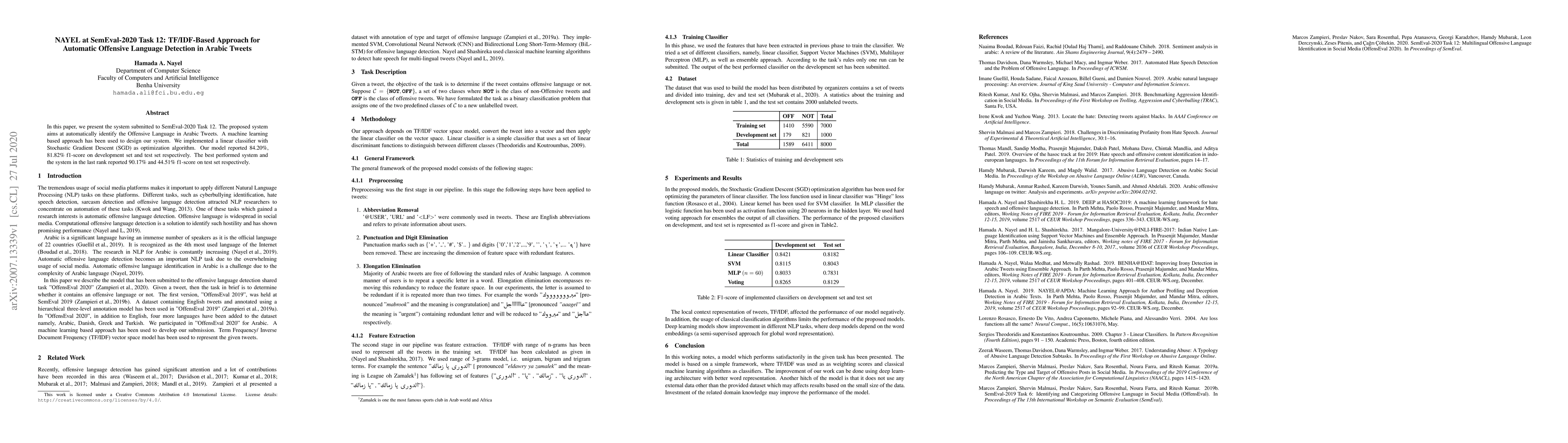 In this paper, we present the system submitted to "SemEval-2020 Task 12". The proposed system aims at automatically identify the Offensive Language in Arabic Tweets. A machine learning based approach has been used to design our system. We implemented a linear classifier with Stochastic Gradient Descent (SGD) as optimization algorithm. Our model reported 84.20%, 81.82% f1-score on development set and test set respectively. The best performed system and the system in the last rank reported 90.17% and 44.51% f1-score on test set respectively.