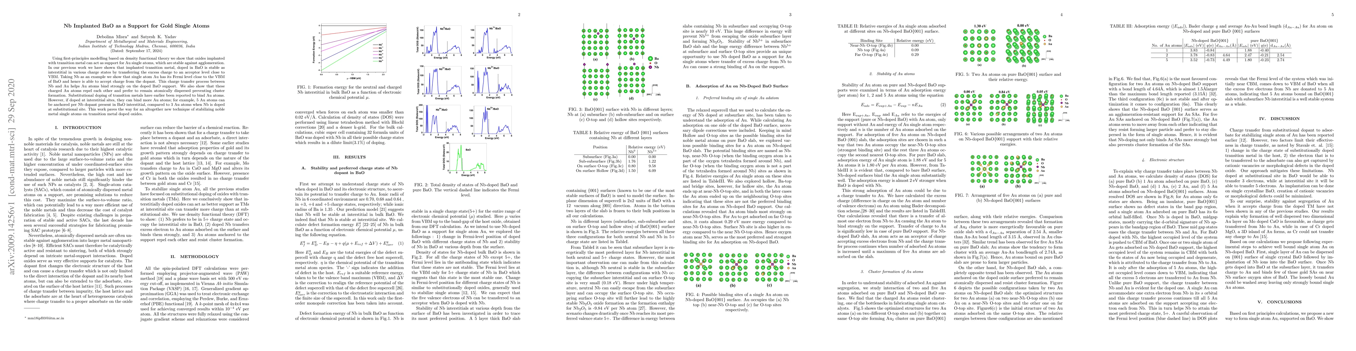 Using first-principles modelling based on density functional theory we show that oxides implanted with transition metal can act as support for Au single atoms, which are stable against agglomeration. In our previous work we have shown that implanted transition metal, doped in BaO is stable as interstitial in various charge states by transferring the excess charge to an acceptor level close to VBM. Taking Nb as an example we show that single atom Au has its Fermi level close to the VBM of BaO and hence is able to accept charge from the dopant. This charge transfer process between Nb and Au helps Au atoms bind strongly on the doped BaO support. We also show that these charged Au atoms repel each other and prefer to remain atomically dispersed preventing cluster formation. Substitutional doping of transition metals have earlier been reported to bind Au atoms. However, if doped at interstitial sites, they can bind more Au atoms; for example, 5 Au atoms can be anchored per Nb dopant present in BaO interstitial, compared to 3 Au atoms when Nb is doped at substitutional site. This work paves the way for an altogether new technique of stabilizing noble metal single atoms on transition metal doped oxides.