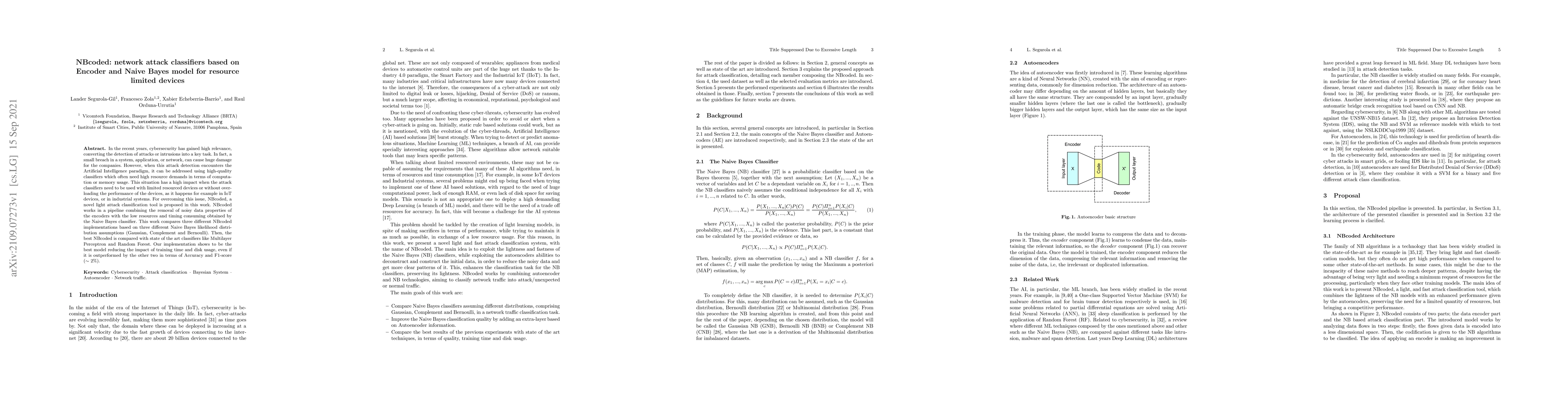 In the recent years, cybersecurity has gained high relevance, converting the detection of attacks or intrusions into a key task. In fact, a small breach in a system, application, or network, can cause huge damage for the companies. However, when this attack detection encounters the Artificial Intelligence paradigm, it can be addressed using high-quality classifiers which often need high resource demands in terms of computation or memory usage. This situation has a high impact when the attack classifiers need to be used with limited resourced devices or without overloading the performance of the devices, as it happens for example in IoT devices, or in industrial systems. For overcoming this issue, NBcoded, a novel light attack classification tool is proposed in this work. NBcoded works in a pipeline combining the removal of noisy data properties of the encoders with the low resources and timing consuming obtained by the Naive Bayes classifier. This work compares three different NBcoded implementations based on three different Naive Bayes likelihood distribution assumptions (Gaussian, Complement and Bernoulli). Then, the best NBcoded is compared with state of the art classifiers like Multilayer Perceptron and Random Forest. Our implementation shows to be the best model reducing the impact of training time and disk usage, even if it is outperformed by the other two in terms of Accuracy and F1-score (~ 2%).