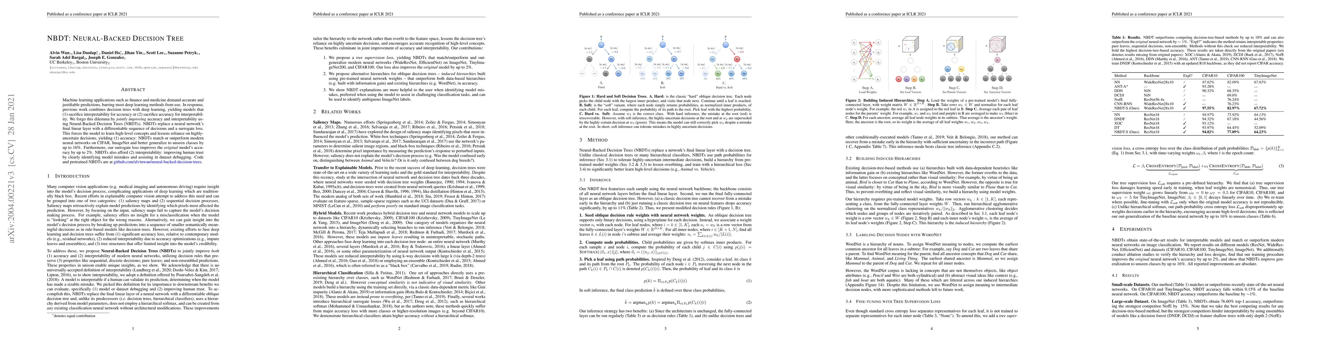 The paper introduces Neural-Backed Decision Trees (NBDTs) to balance accuracy and interpretability in machine learning. NBDTs enhance both by replacing a neural network's final layer with a differentiable decision tree, achieving competitive accuracy and improved generalizability while maintaining clear interpretability.