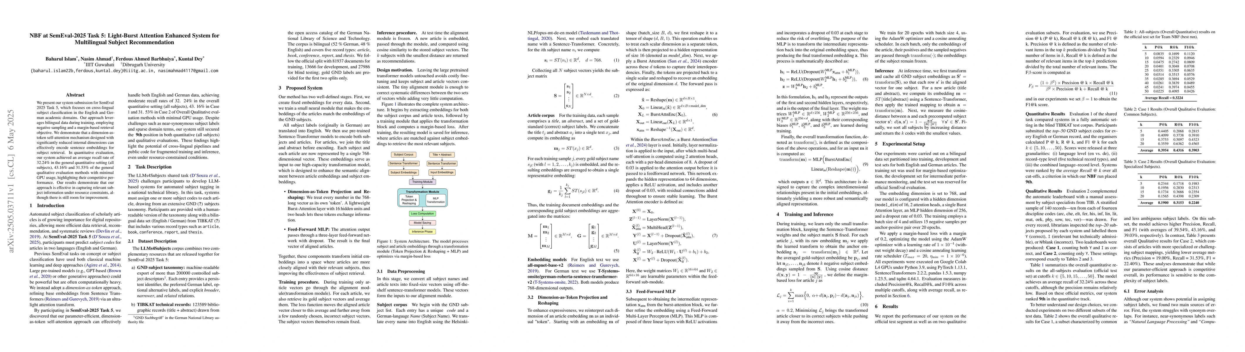 We present our system submission for SemEval 2025 Task 5, which focuses on cross-lingual subject classification in the English and German academic domains. Our approach leverages bilingual data during training, employing negative sampling and a margin-based retrieval objective. We demonstrate that a dimension-as-token self-attention mechanism designed with significantly reduced internal dimensions can effectively encode sentence embeddings for subject retrieval. In quantitative evaluation, our system achieved an average recall rate of 32.24% in the general quantitative setting (all subjects), 43.16% and 31.53% of the general qualitative evaluation methods with minimal GPU usage, highlighting their competitive performance. Our results demonstrate that our approach is effective in capturing relevant subject information under resource constraints, although there is still room for improvement.