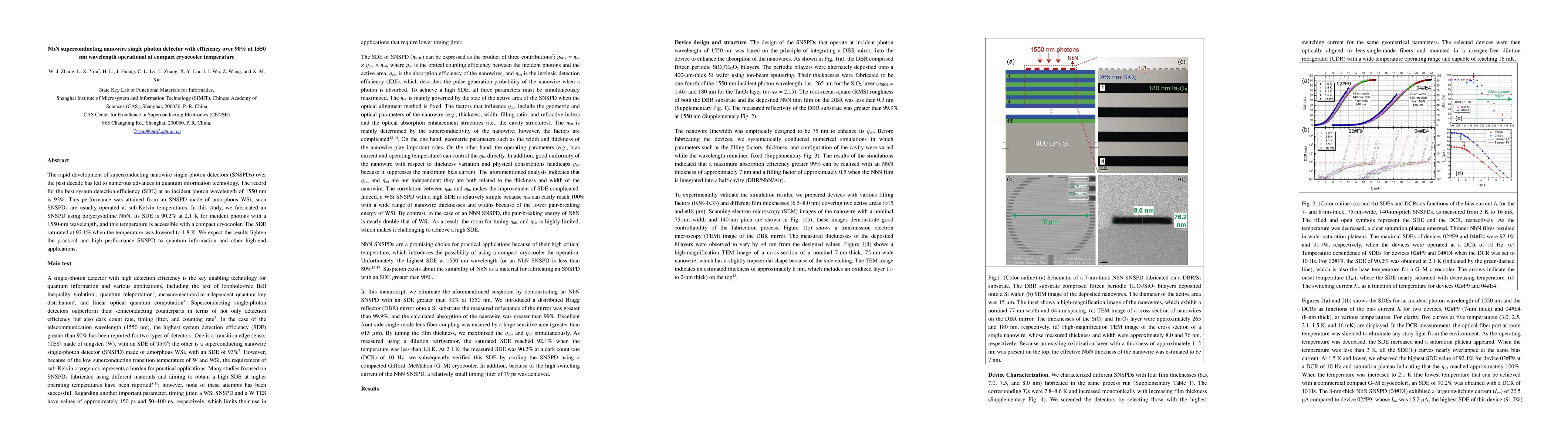This paper reports a polycrystalline NbN superconducting nanowire single photon detector (SNSPD) achieving a system detection efficiency (SDE) of 90.2% at 1550 nm wavelength, operational at 2.1K with a compact cryocooler, enhancing its practicality for quantum information technology. The SDE further improved to 92.1% at 1.8K.