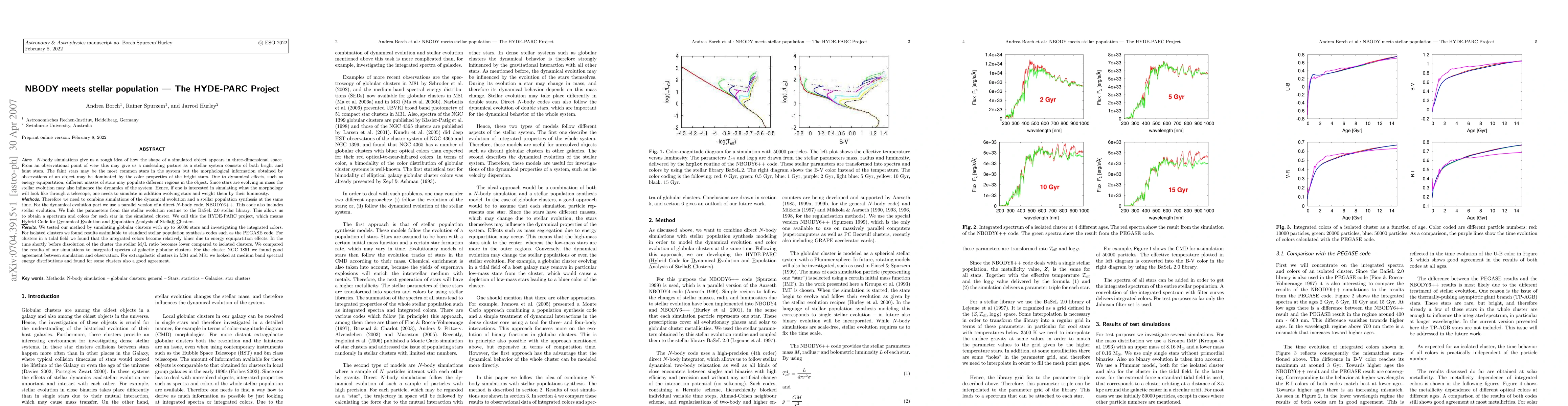 N-body simulations give us a rough idea of how the shape of a simulated object appears in three-dimensional space. From an observational point of view this may give us a misleading picture. The faint stars may be the most common stars in the system but the morphological information obtained by observations of an object may be dominated by the color properties of the bright stars. Due to dynamical effects, such as energy equipartition, different masses of stars may populate different regions in the object. Since stars are evolving in mass the stellar evolution may also influence the dynamics of the system. Hence, if one is interested in simulating what the morphology will look like through a telescope, one needs to simulate in addition evolving stars and weight them by their luminosity. Therefore we need to combine simulations of the dynamical evolution and a stellar population synthesis at the same time. For the dynamical evolution part we use a parallel version of a direct N-body code, NBODY6++. This code also includes stellar evolution. We link the parameters from this stellar evolution routine to the BaSeL 2.0 stellar library. For isolated clusters we found results assimilable to standard stellar population synthesis codes such as the PEGASE code. For clusters in a tidal field we found that the integrated colors become relatively bluer due to energy equipartition effects. In the time shortly before dissolution of the cluster the stellar M/L ratio becomes lower compared to isolated clusters. We compared the results of our simulations to integrated spectra of galactic globular clusters. For the cluster NGC 1851 we found good agreement between simulation and observation. For extragalactic clusters in M81 and M31 we looked at medium band spectral energy distributions and found for some clusters also a good agreement.