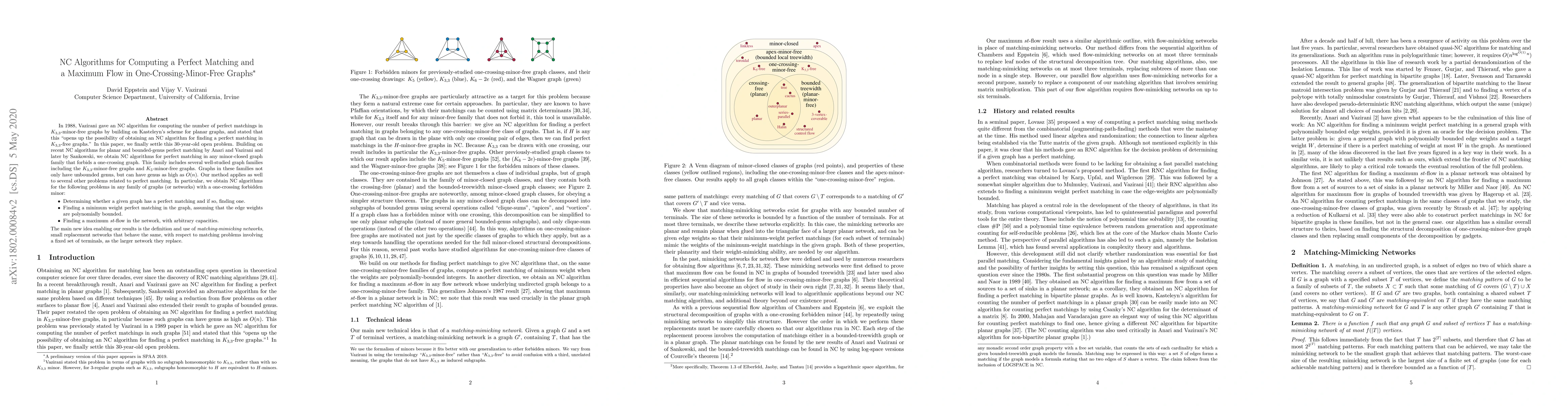 This paper presents NC algorithms for computing perfect matchings and maximum flows in one-crossing-minor-free graphs, solving a 30-year-old open problem. The authors utilize matching-mimicking networks to achieve these results, extending beyond planar graphs to handle families like $K_{3,3}$-minor-free and $K_5$-minor-free graphs with high genus.