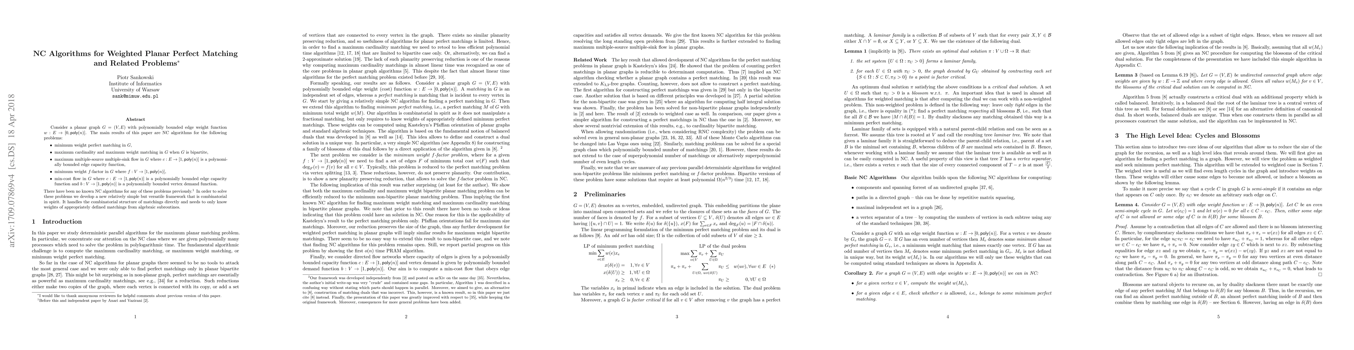This paper presents NC algorithms for several weighted planar graph problems, including minimum weight perfect matching, maximum cardinality/weight matching in bipartite graphs, maximum flow, minimum weight f-factor, and min-cost flow. The authors introduce a new combinatorial framework to solve these previously unsolvable problems in NC.
