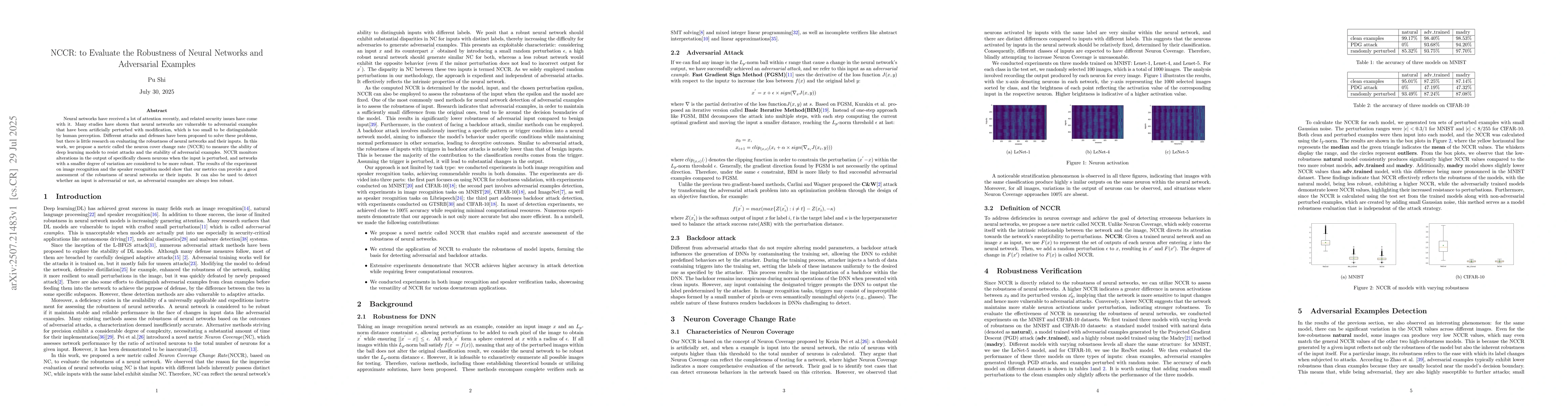 Neural networks have received a lot of attention recently, and related security issues have come with it. Many studies have shown that neural networks are vulnerable to adversarial examples that have been artificially perturbed with modification, which is too small to be distinguishable by human perception. Different attacks and defenses have been proposed to solve these problems, but there is little research on evaluating the robustness of neural networks and their inputs. In this work, we propose a metric called the neuron cover change rate (NCCR) to measure the ability of deep learning models to resist attacks and the stability of adversarial examples. NCCR monitors alterations in the output of specifically chosen neurons when the input is perturbed, and networks with a smaller degree of variation are considered to be more robust. The results of the experiment on image recognition and the speaker recognition model show that our metrics can provide a good assessment of the robustness of neural networks or their inputs. It can also be used to detect whether an input is adversarial or not, as adversarial examples are always less robust.
