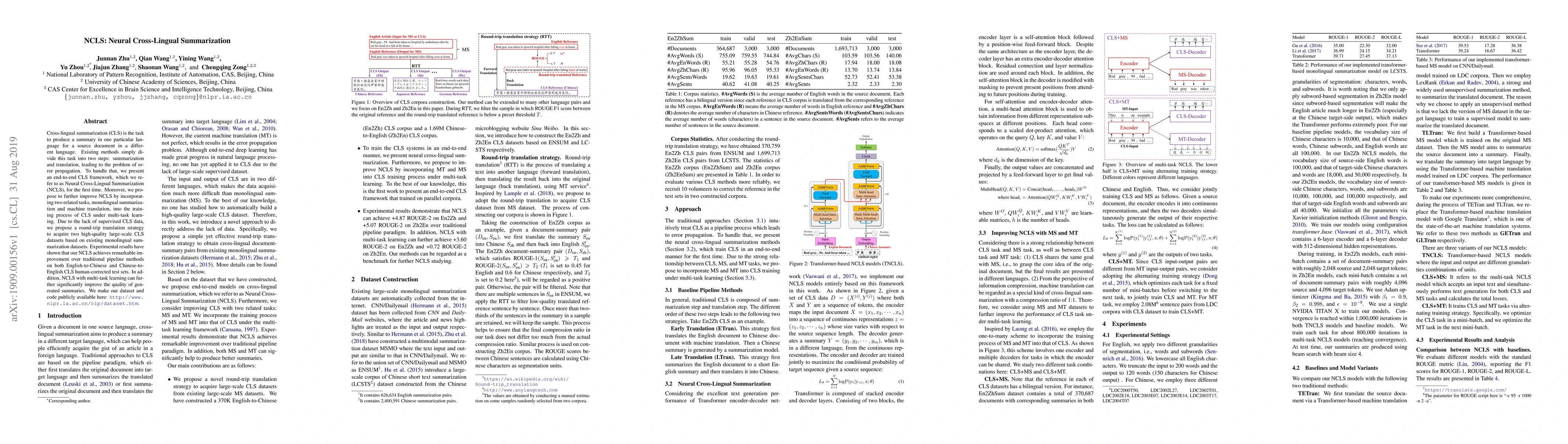 The paper introduces Neural Cross-Lingual Summarization (NCLS), an end-to-end framework for producing summaries in one language from source documents in another, addressing the issue of error propagation in traditional two-step summarization and translation methods. It further enhances NCLS through multi-task learning incorporating monolingual summarization and machine translation, and provides large-scale datasets via a round-trip translation strategy.