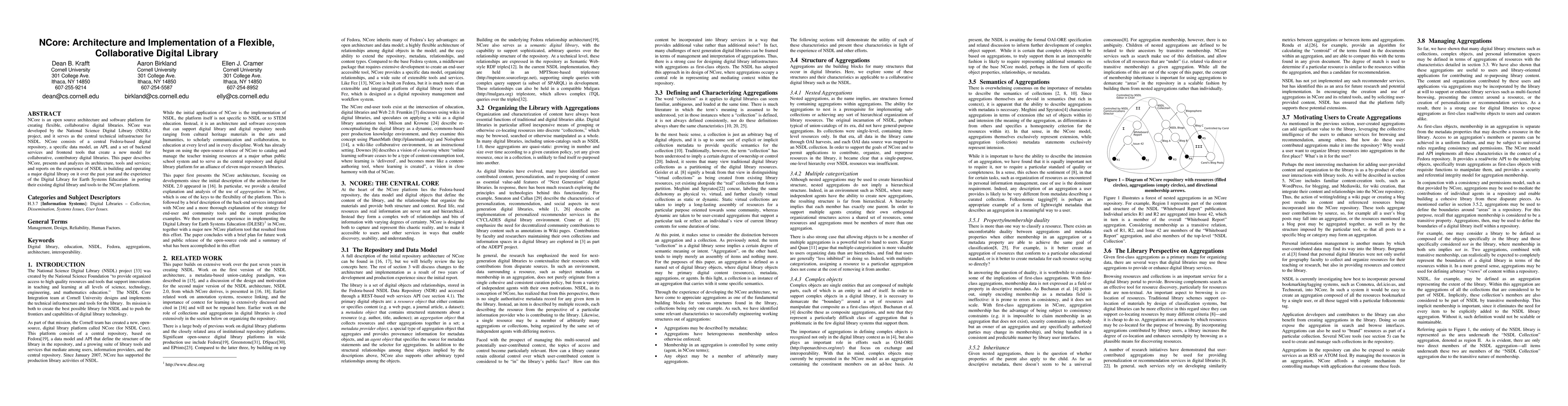 NCore is an open-source architecture for flexible, collaborative digital libraries developed by the NSDL project, featuring a Fedora-based repository and various tools for contributory collaboration. The paper analyzes its architecture and presents experiences from NSDL and the Digital Library for Earth Systems Education in using it.