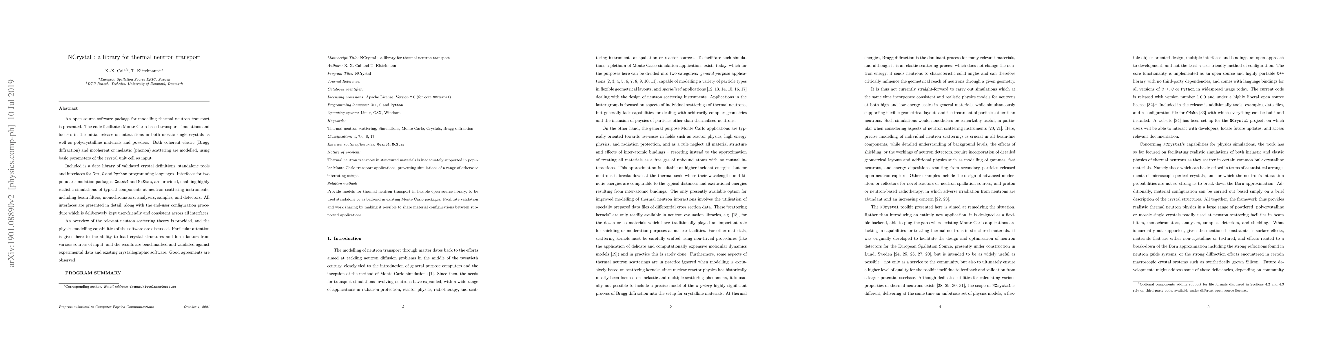 NCrystal is an open-source library for thermal neutron transport simulations, enabling Monte Carlo simulations of neutron interactions in single and polycrystalline materials. It supports both elastic and inelastic scattering, and includes interfaces for C++, C, and Python, as well as Geant4 and McStas, ensuring compatibility with existing simulation frameworks.