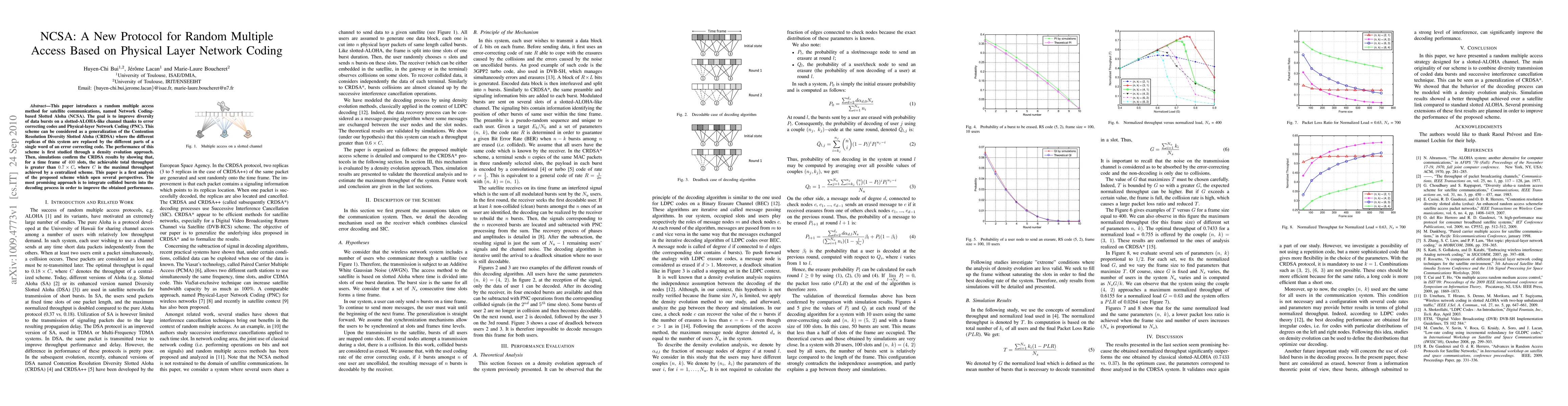 This paper proposes Network Coding-based Slotted Aloha (NCSA), a new random multiple access method for satellite communications using Physical-layer Network Coding (PNC) to enhance burst diversity. Simulations show NCSA achieves a throughput greater than 0.7 times the centralized scheme's maximal throughput (C) for 400 slots, indicating improved performance. Future work includes integrating collided bursts into decoding to further boost results.