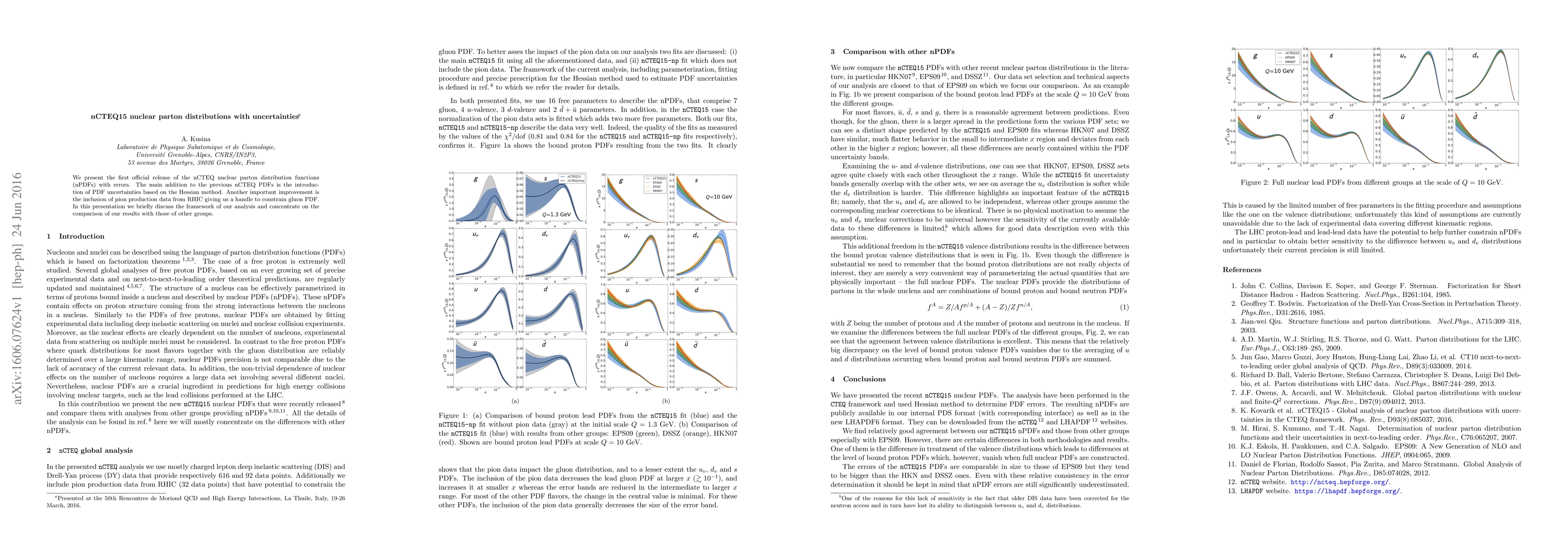 This paper introduces the nCTEQ15 nuclear parton distribution functions (nPDFs) with quantified uncertainties using the Hessian method, and includes pion production data from RHIC to better constrain the gluon PDF. The authors compare their results with other groups to validate the improvements.